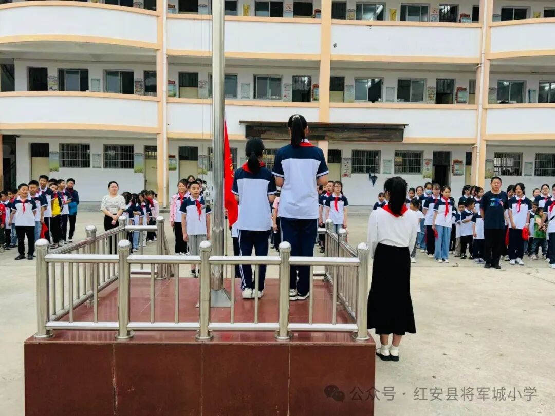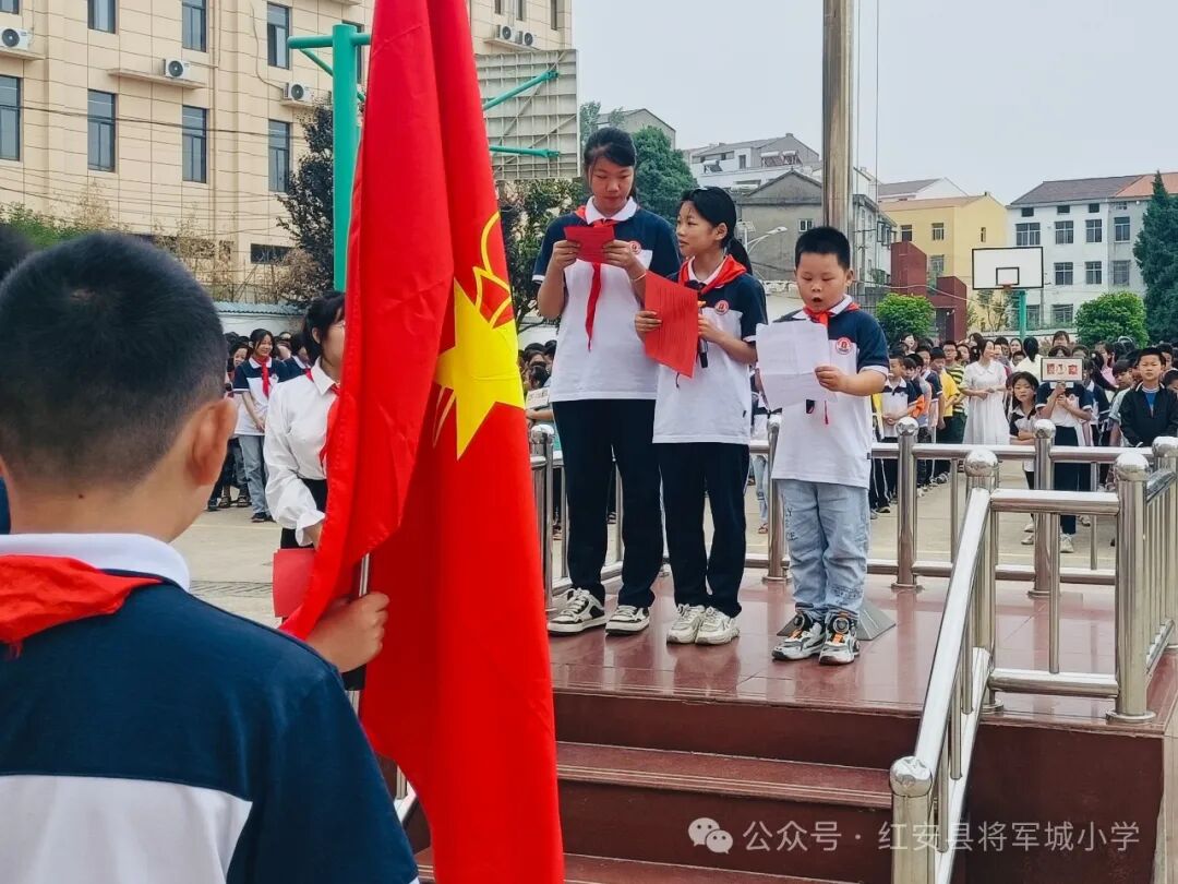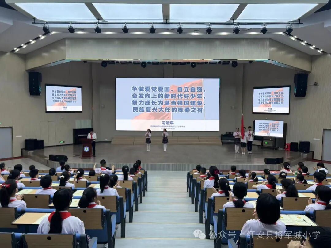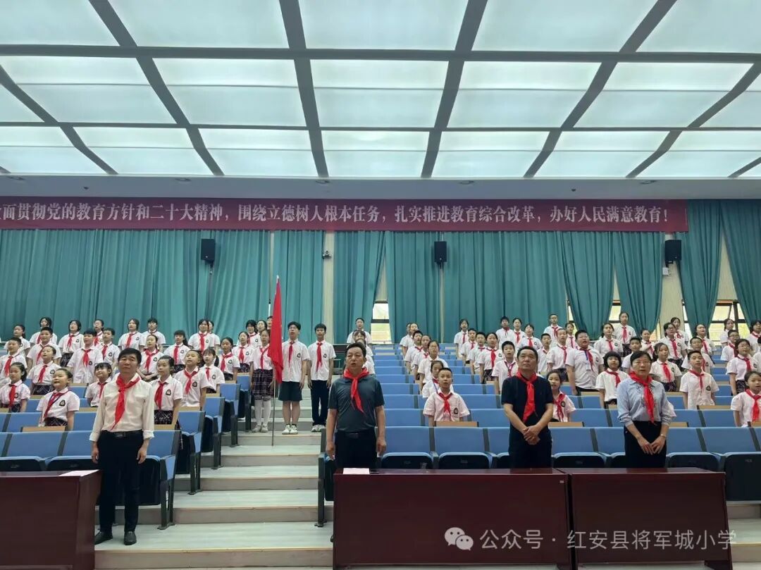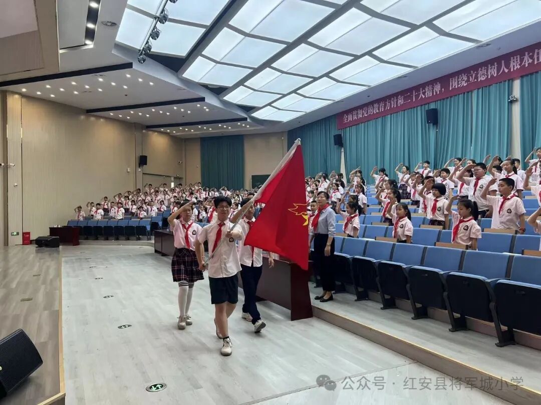 红安县将军城小学核心校主题队日暨颁章典礼,在庄严的国歌声中拉开序幕。伴随着激昂的《出旗曲》,旗手迈着整齐的步伐,护送少先队大队队旗入场,全体队员高擎右手敬队礼。嘹亮的《我们是共产主义接班人》,唱出新时代少年儿童红心向党,阳光向上的精神风貌。