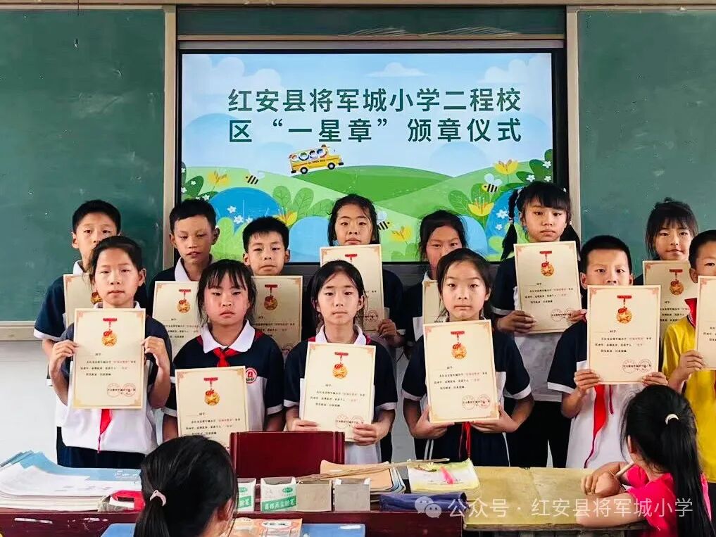 红安县将军城小学二程校区少工委,举办“红领巾 爱祖国”主题大队会暨“红领巾奖章”颁章仪式,为获得2024年“红领巾奖章”一星章的代表颁发证书。少先队员代表交流争章心得。