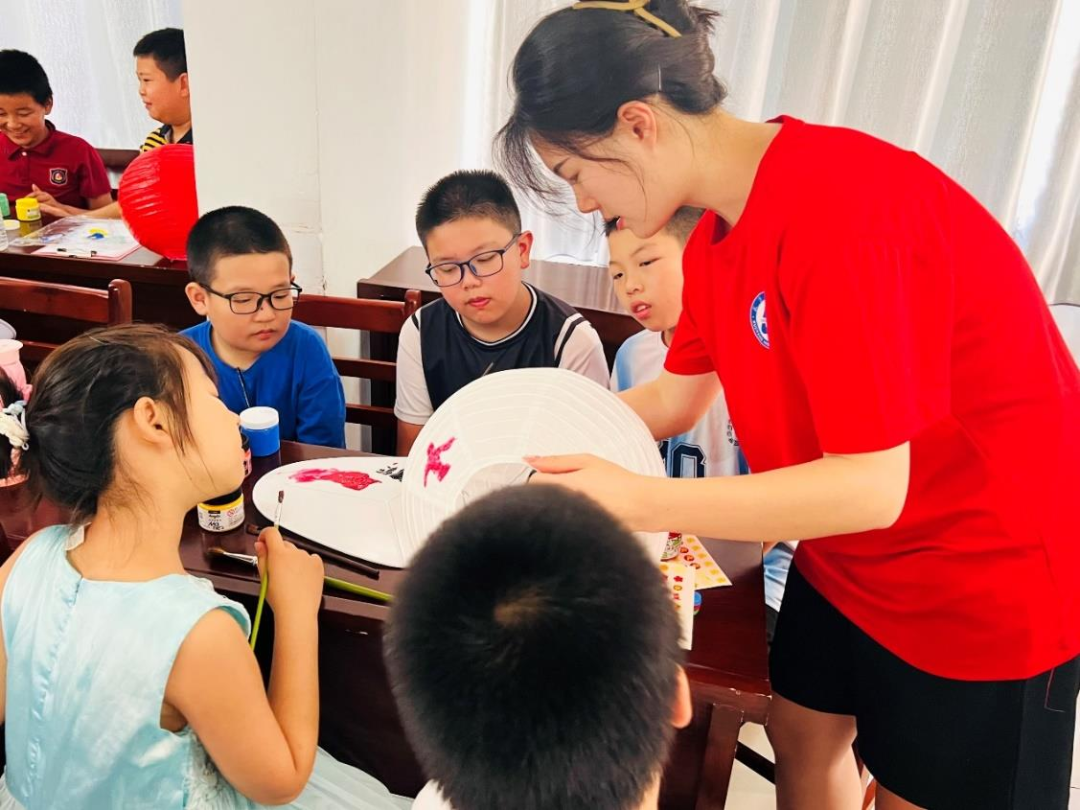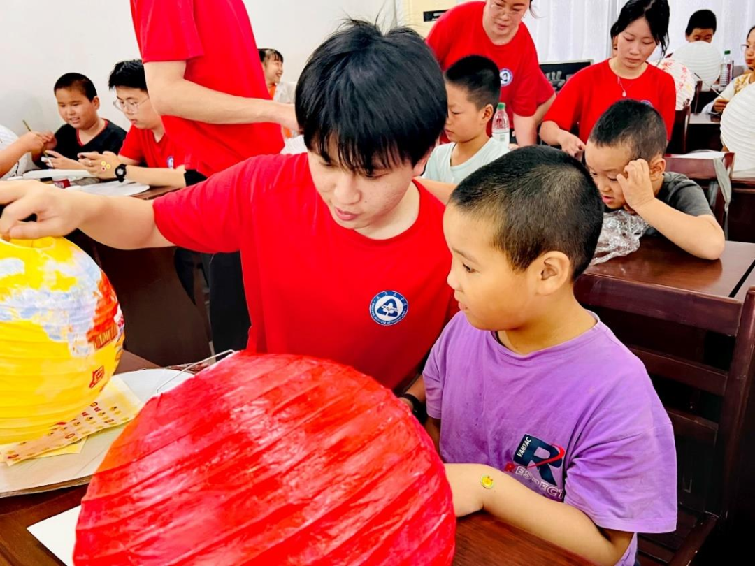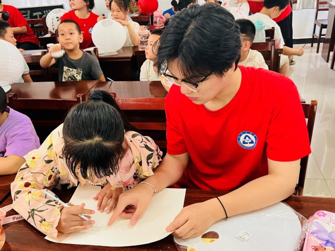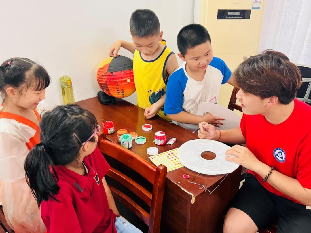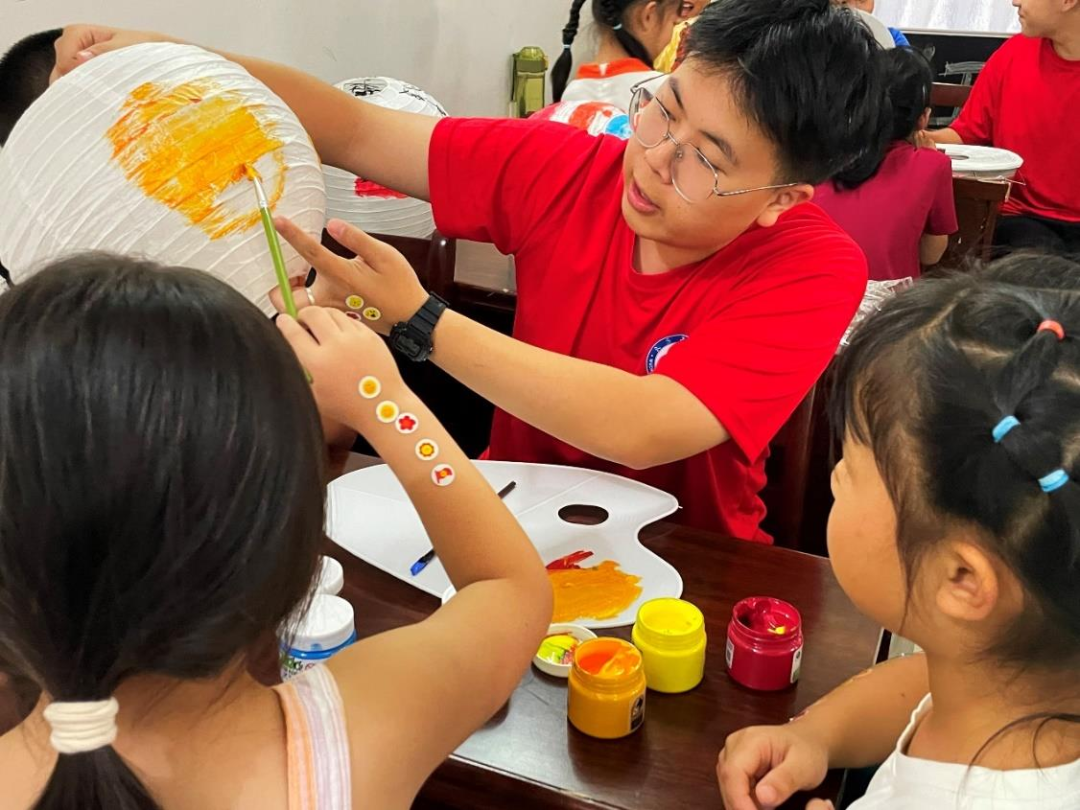 图为团队成员正辅助小朋友们在灯笼上绘画,防止戳破。(中国青年网通讯员蔡博翰供图)