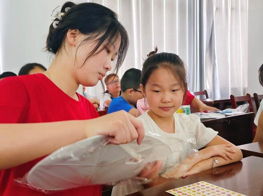 图为团队成员正在为接下来的画画做准备工作,帮助小朋友拆颜料工具。(中国青年网通讯员徐芷妍供图)
