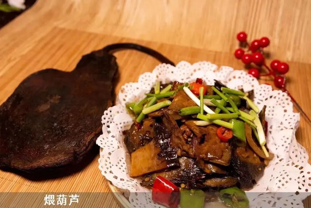 煨葫芦是红安县北部居民喜欢制作的一道特色干菜,是红安县独具特色蔬菜系列之一。该菜的制作原料是本地生长的鲜嫩葫芦,到了采收季节,摘下后,放置在稻草燃烧后尚未熄灭的热灰中,待葫芦变柔软后,从灰中取出,用木板缓缓加压,直到葫芦冷却,又放入热灰中加热,至葫芦柔软后再加压,如此反复5-6次,直到将葫芦压成厚1-2厘米的薄片,然后凉干,即可食用或出售。煨葫芦在制作中,葫芦未遭破损或其它处理,故既保持了原有特色,又别具风味。