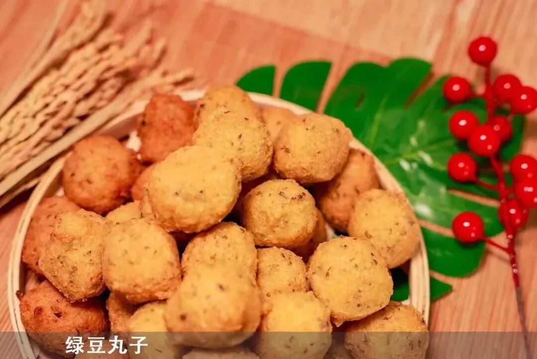 绿豆丸子创于清末。丸子香软,呈褐红色,约野鸡蛋大小。制法:绿豆、饭豆2:8的比例,混合投人清水中浸泡一天左右,洗净捞起,加适量的水磨成浆,用匙挑起球状,逐个放进炽热的油锅中,炸成金黄色即成。丸子常作复合菜,也可单独食用,如加些香料,吃起来味美可口,疏松香甜。