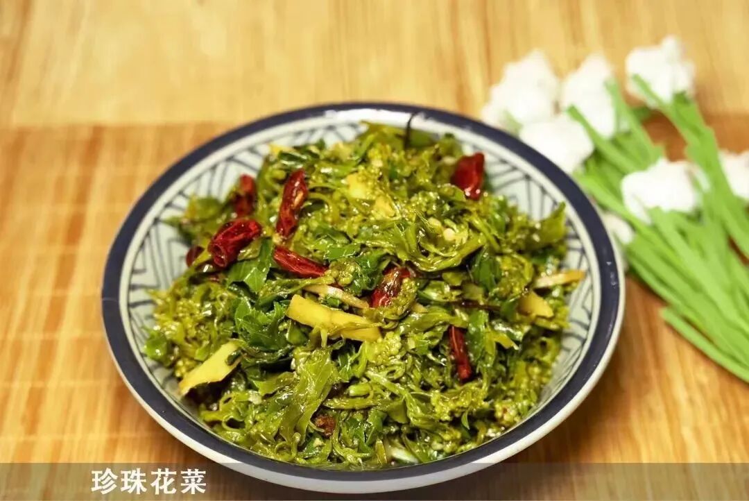珍珠花系生长于红安县北山区的一种野菜,明代《黄安初乘》(明户部尚书耿定向著)有记载,当清明前后,珍珠菜含苞待放时和嫩叶一起采摘,放入开水锅中烫至黄色,捞出晒后备用。食用时用温水泡胀,再用清水漂过,随肉小炒,如与腊肉蒸食,味更佳。具有柔和、清香、耐食等特点。