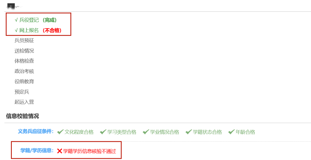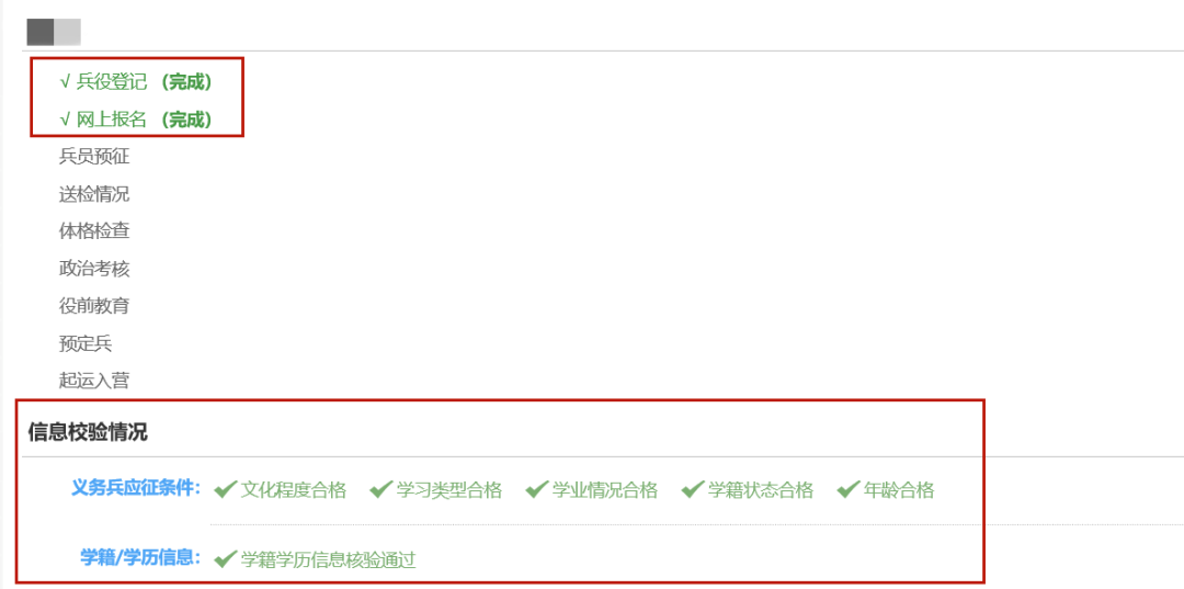 登录全国征兵网,可直接查看报名是否完成。一般可以分为:完成、不合格和应征信息校验中等情况,如下图所示: