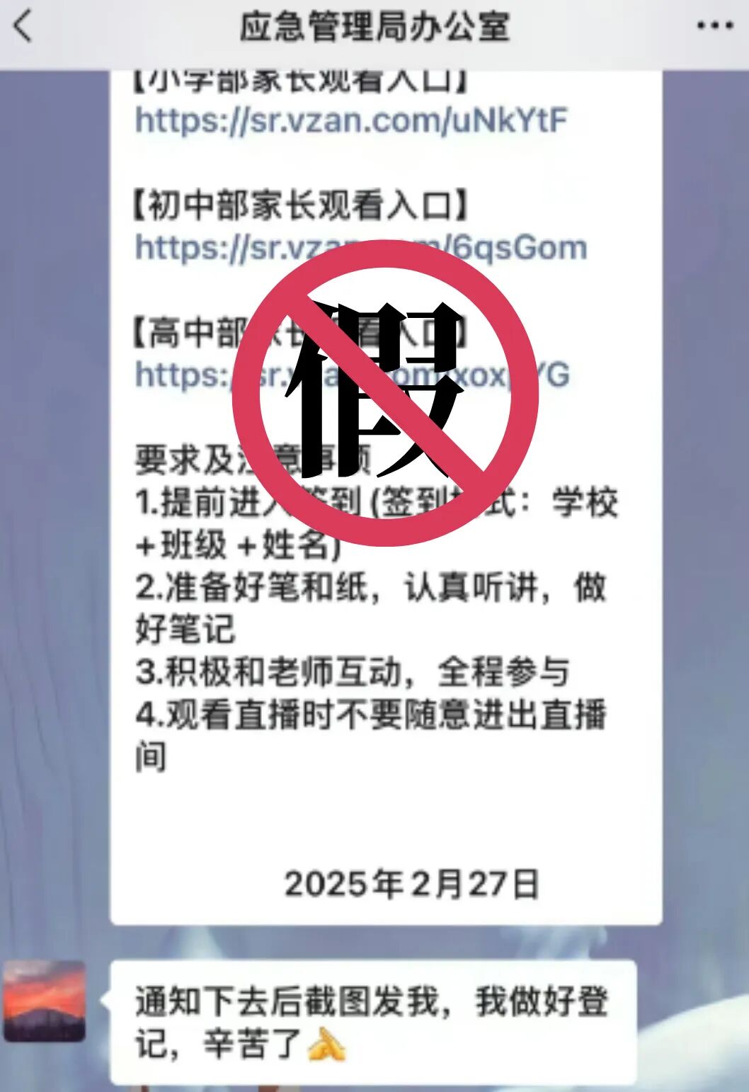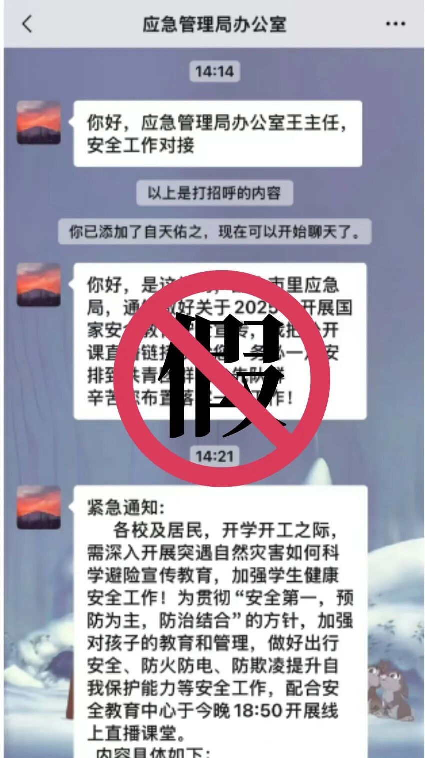 近期,一名自称是“应急局办公室王主任”发消息称:“为配合市应急局做好2025年国家安全教育宣传,要求县应急管理局工作人员把公开课直播链接安排到共青团群和少先队群观看。”经红安县应急管理局核实为虚假信息。经了解,这是一种以学生安全教育为幌子的网络骗局,其手法是以上级某单位工作人员的名义添加应急、教育等部门工作人员微信后,通过学生家长群发布安全教育课直播链接诱导学生、家长观看网络直播,在直播中诱导家长购买“**教育课程、**书籍”等。