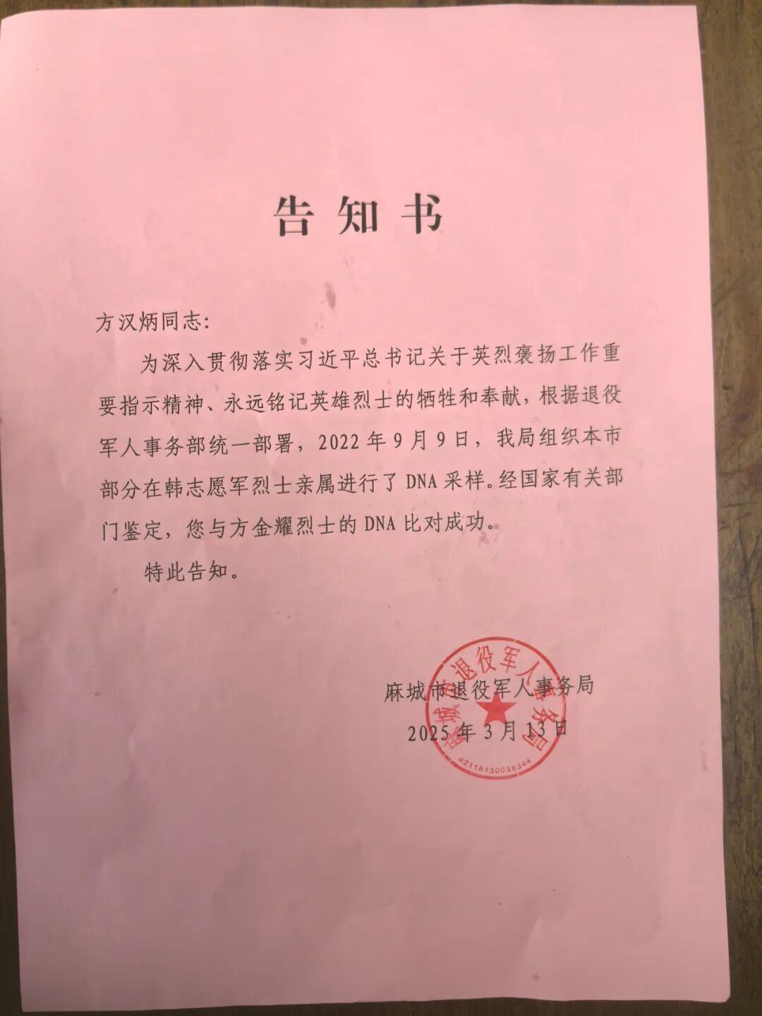 麻城市退役军人事务局发出的告知书