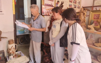 在长胜街根雕非遗传承人叶伯奎的家中,摆满了形态各异的根雕作品,有的像威风凛凛的猛虎,有的像展翅欲飞的雄鹰,还有的像神态安详的老者,每一件都栩栩如生,仿佛在诉说着岁月的故事。叶老师分享了自己多年来创作根雕的经历,从选材、构思到雕刻,每一个环节都凝聚着心血和汗水。叶老介绍,红安根雕的最大特点是“三分人工,七分天然”,在创作中充分利用树根的天然形态和纹理,尽量减少人工雕琢的痕迹,展现出自然之美和自然之趣。小时候,他就已经表现出对艺术的极大兴趣和天赋,但碍于种种原因,一开始并未走上根雕这条路,后来几经辗转,与根雕产生了紧密的联系。叶老先生还饶有兴趣地向实践队介绍他所写的诗,字字句句,真挚动人。