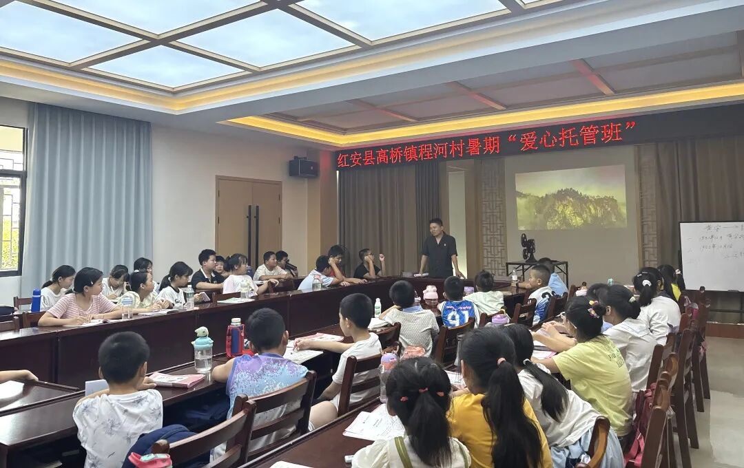 红安网消息 为增强青少年法律意识,筑牢青少年健康成长的法治防线,7月18日,红安法院刑事审判庭干警、少先队校外辅导员吴琦峰走进高桥镇程河村“爱心托管班”,为孩子们送上了一堂生动的法治教育课。