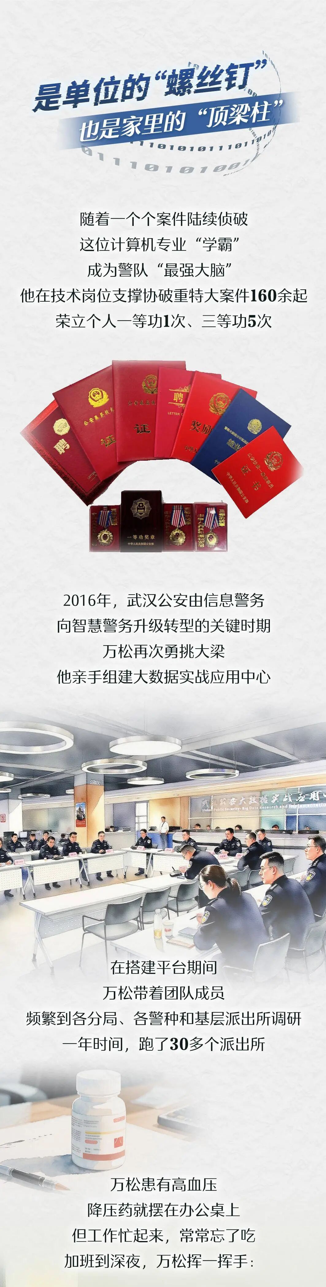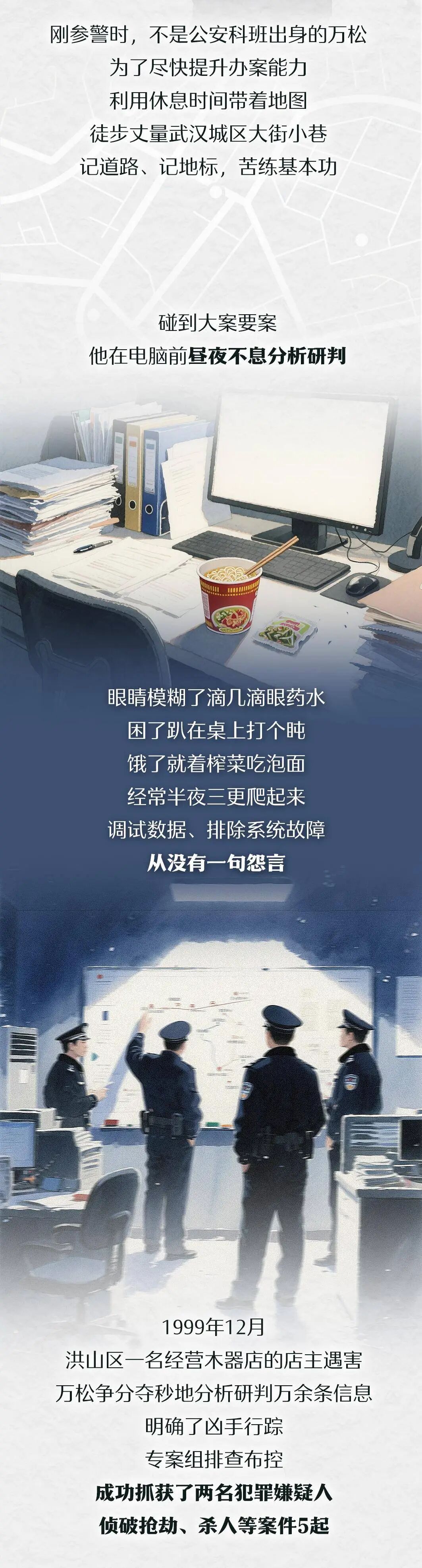 万松生前任武汉市公安局科技信息化支队三大队警务技术四级主任,曾先后荣立个人一等功1次、三等功5次。2025年5月26日,万松同志在组织完端午节安保风险研判后突发疾病,经送医抢救无效,于5月27日不幸牺牲,年仅50岁。