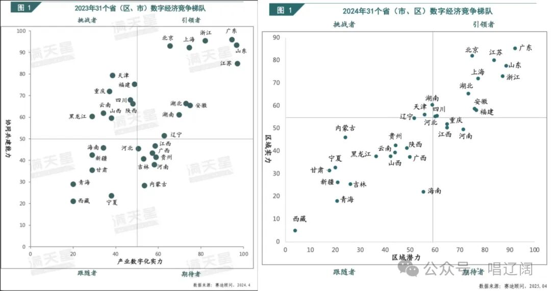 对比2023年和2024年的两张图,湖北与一直处于全国数字经济第一梯队的上海之间的距离明显接近。