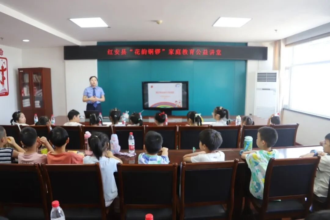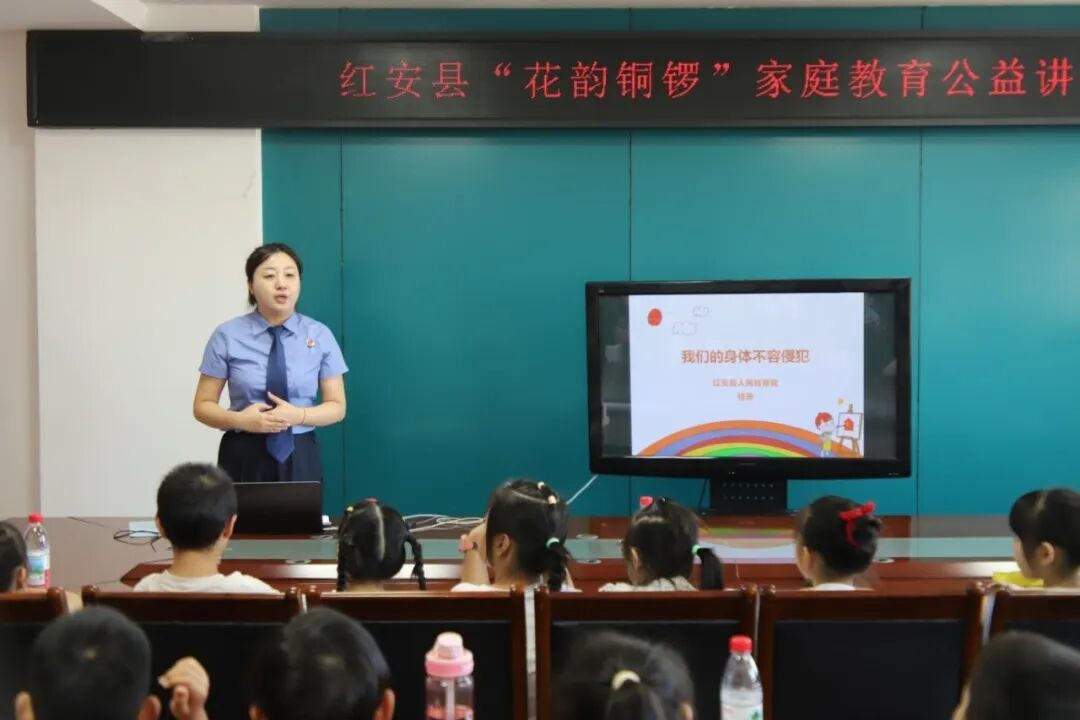 红安网消息 为增强儿童自我保护意识和能力,筑牢暑期安全防线,8月14日,红安县人民检察院检察官以“花韵铜锣家庭教育讲师”身份,受邀走进红安县电力局暑期“爱心托管班”,为30余名6至9岁的小学生带来了一堂生动、实用的“我们的身体不容侵犯”自我防护法治课。