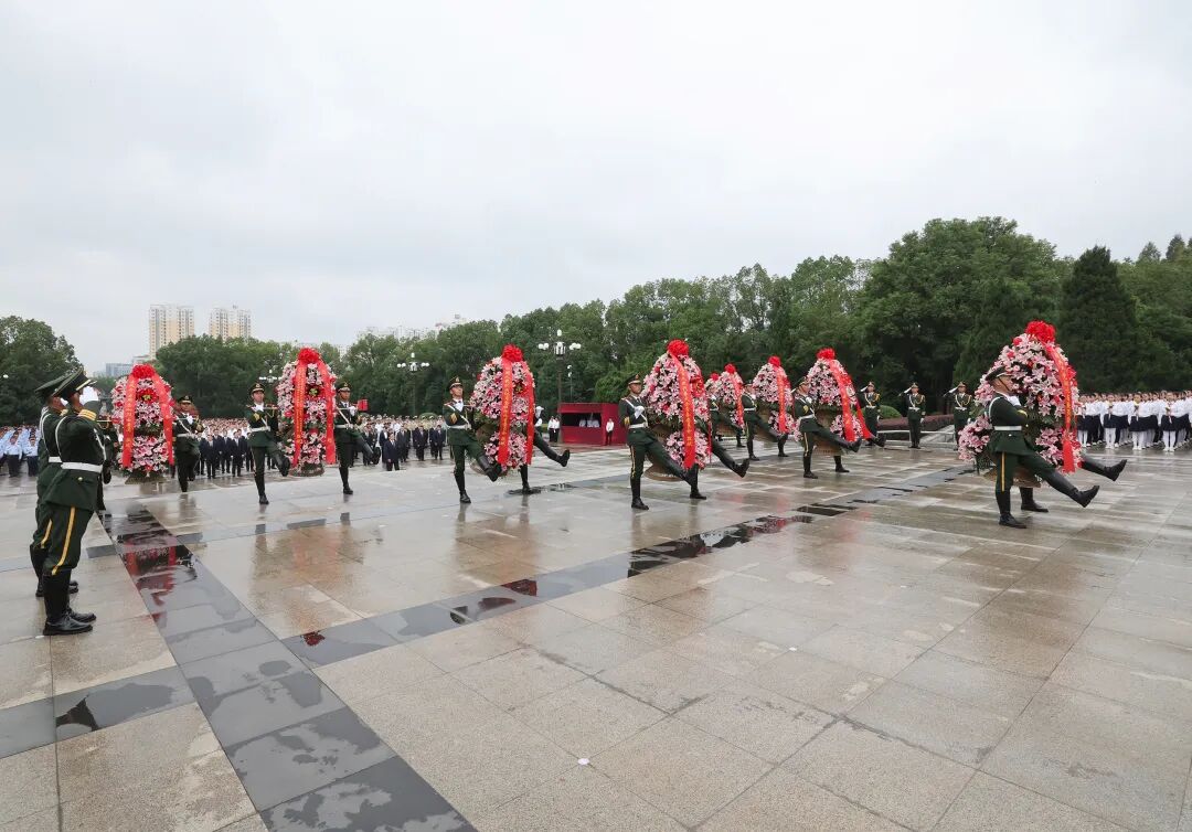 秋雨寄哀思,鲜花献英烈。雨后的纪念园广场上,苍松翠柏环绕的革命烈士纪念碑巍然耸立。省领导与老战士、烈属、劳模、先进人物及驻鄂部队官兵、机关干部、学生等各界代表一道,面向纪念碑列队站立。