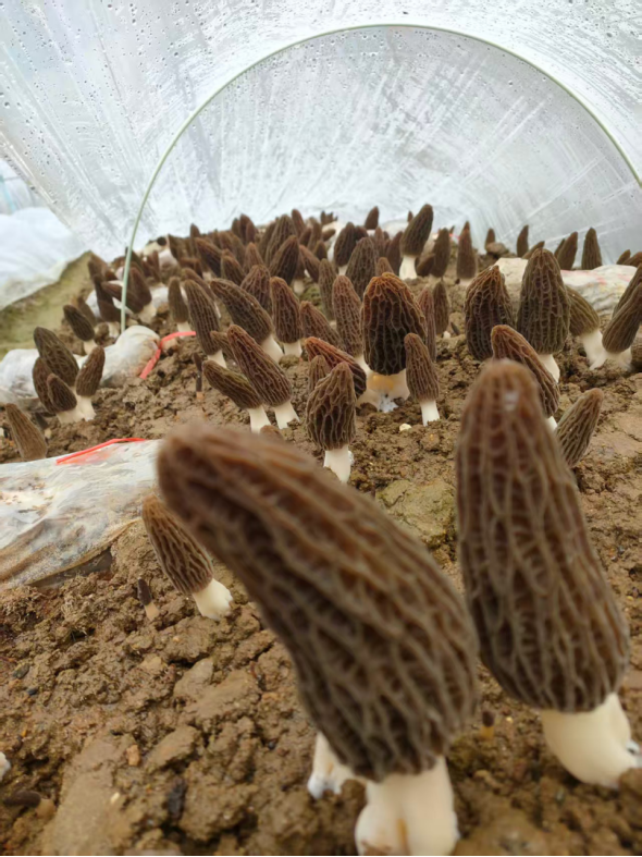 山下蔬菜大棚里,羊肚菌正撑起“致富伞”。作为特色种植的尝试,村里几年前引入这一珍稀食用菌,如今形成“苕蔬菌”轮作模式——羊肚菌秋冬种、冬春收,与红苕生长周期错开,让土地不空闲还能增肥。大棚里,羊肚菌如褐色小伞破土而出,鲜嫩肥厚。村民采摘时小心翼翼,毕竟这是“世界四大名菌”之一。