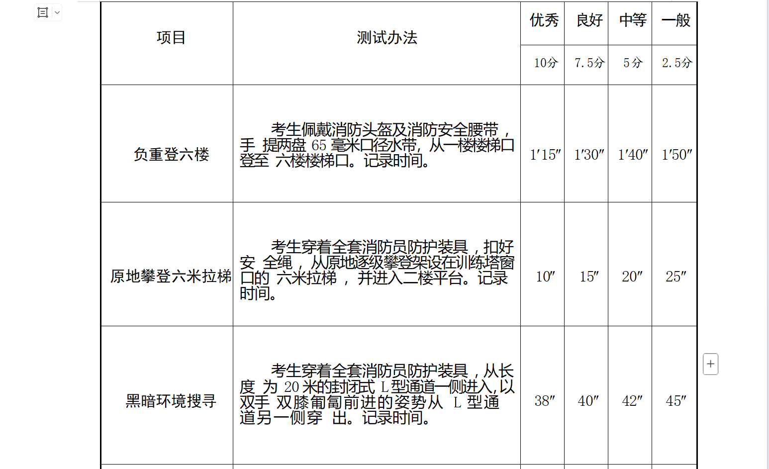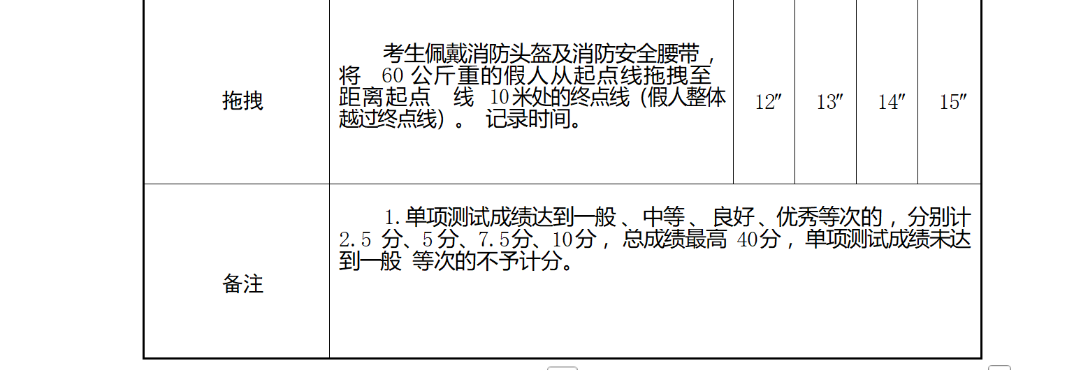 (1)灭火救援员岗位:统一组织,主要考察招录对象协调能力、空间位置感知以及对高空环境的心理适应度。共4个项目,分别为负重登六楼、原地攀登六米拉梯、黑暗环境搜寻、拖拽,其中任一单项未达到一般等次的不予录用。