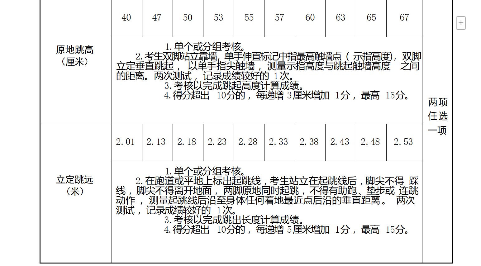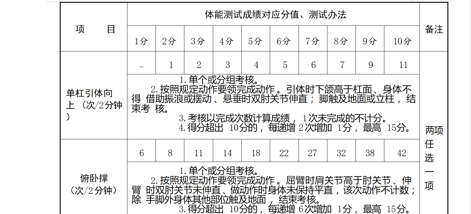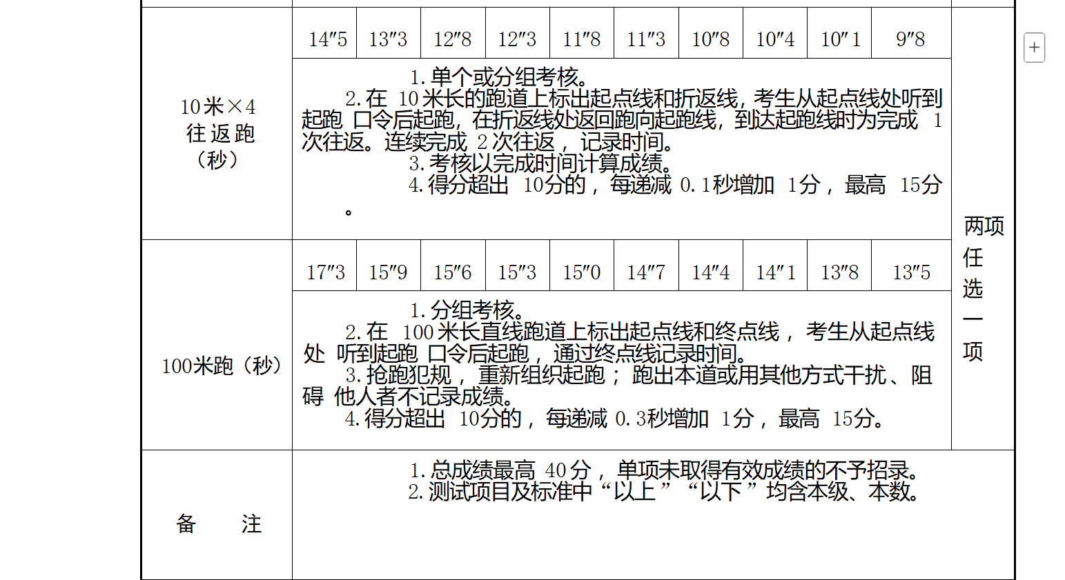 2.体能测试:统一组织实施,根据《体能测试、岗位适应性测试项目及标准》(见附件3)执行,均实行量化评分。其中:体能测试单项有效成绩为1分~15分,总成绩最高40分,任一单项未取得有效成绩的,不予录用。