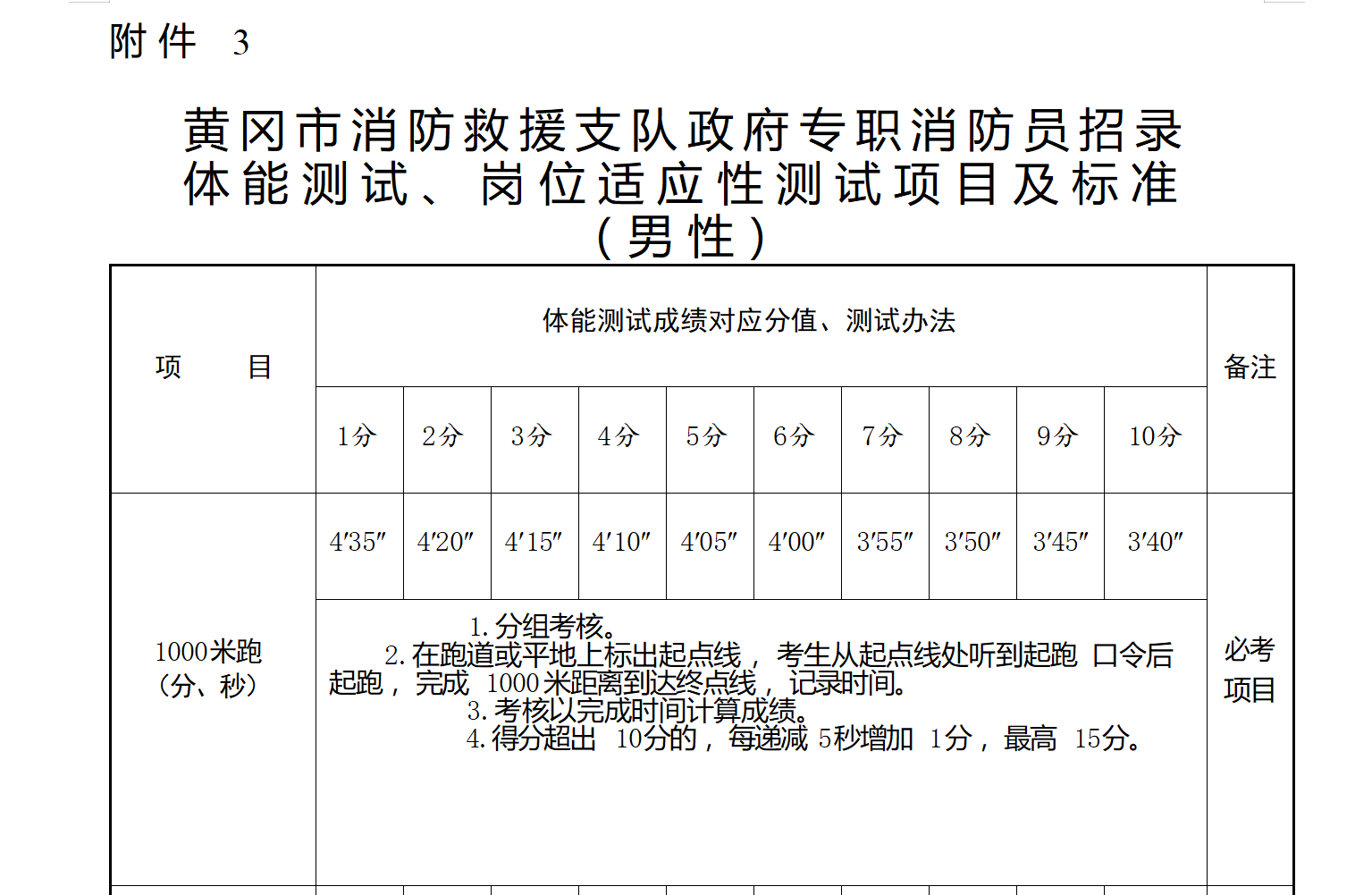 附件3 黄冈市消防救援支队政府专职消防员招录体能测试 、岗位适应性测试项目及标准(男性)