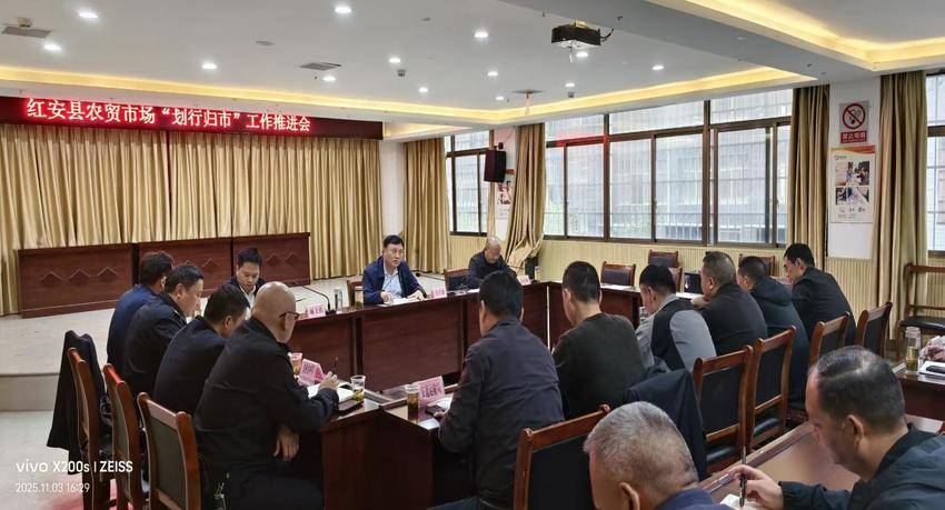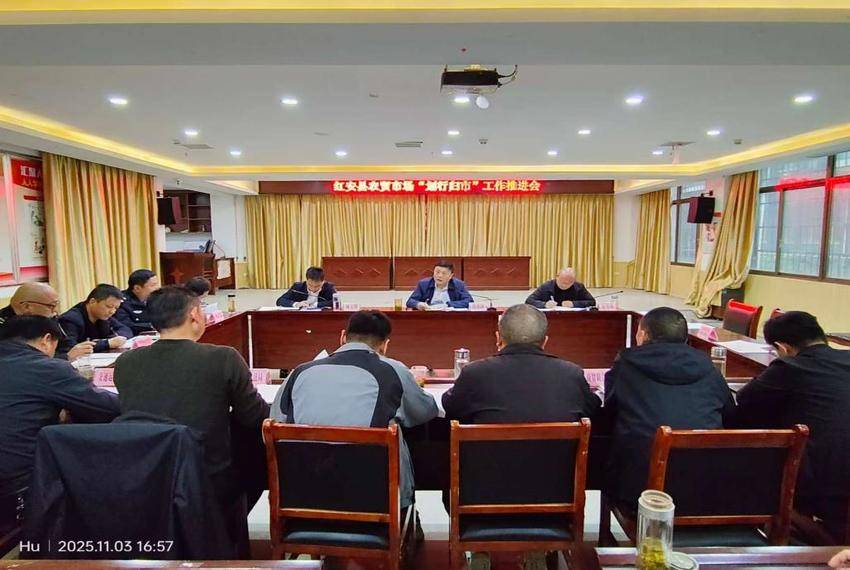 红安网消息 11月3日下午,红安县农贸市场“划行规市”工作推进会在土井社区分指挥部召开。会议旨在统一思想,凝聚合力,对即将开展的凌晨蔬菜批发市场易迁联动执法行动进行精细化部署。会议由湖北金沙湖国家湿地公园主任冯兴潮同志主持,县人大办、县政法委、公安局、市场监督管理局、城管执法局等十余家相关单位及城关镇、社区负责人参加会议,吹响了“划行规市”攻坚行动的集结号。
