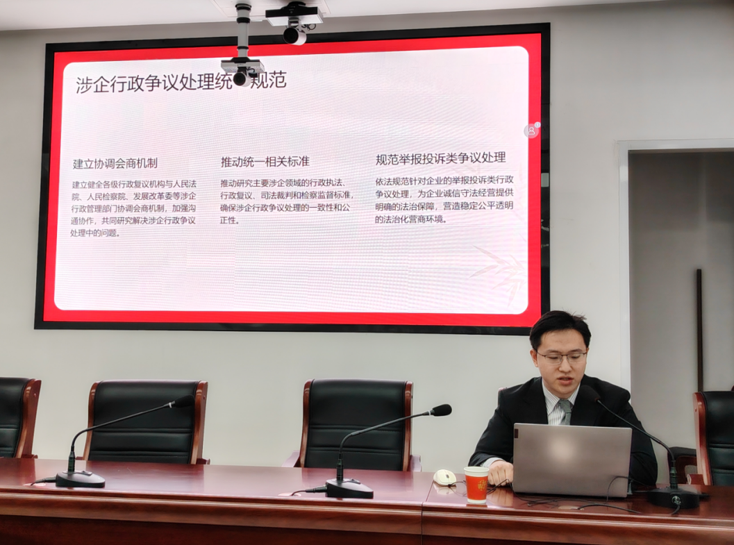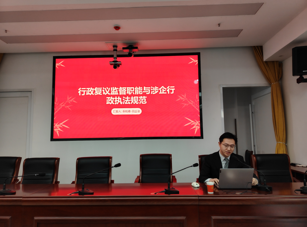 会议特别邀请了泰和泰(武汉)律师事务所田正非律师担任主讲人。田律师围绕行政复议与规范涉企行政执法开展专题授课,详细阐述了行政复议在规范涉企行政执法中的重要作用、如何通过行政复议规范涉企行政执法等内容,并结合具体案例深入讲解了常见涉企领域行政执法突出问题及解决建议。