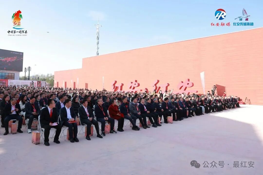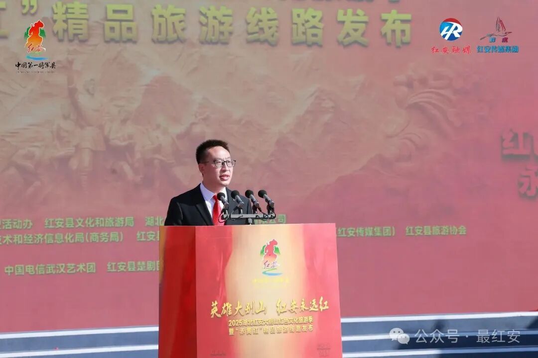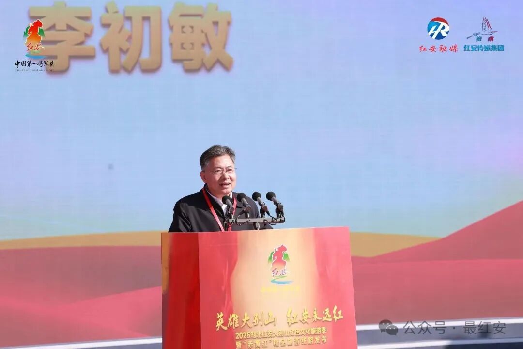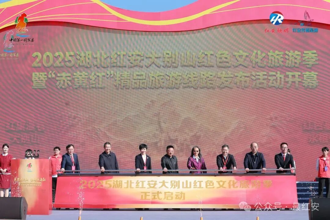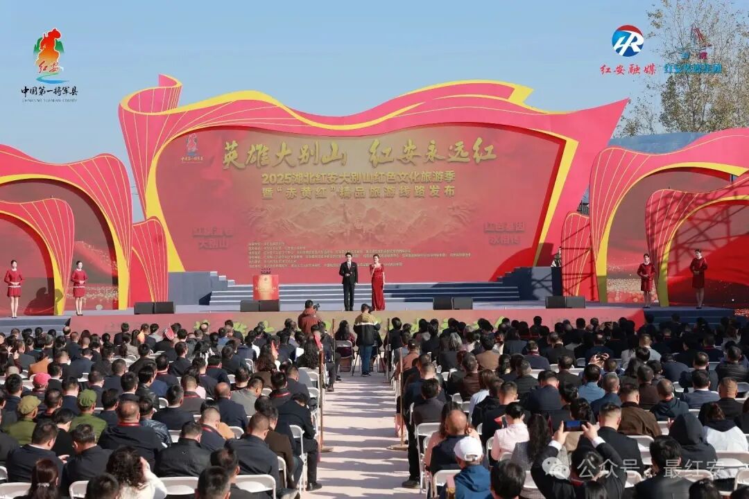 红安网消息 英雄大别山,红安永远红。11月13日,2025湖北红安大别山红色文化旅游季开幕式在黄安古城红安影视幻城举行,“赤黄红”精品旅游线路同步发布。中宣部文艺局原局长、“学习强国”原总编辑、武汉大学特聘教授刘汉俊,住建部帮扶办公室主任、村镇建设司一级巡视员董红梅,湖北省委宣传部副部长向红林,黄冈市委常委、宣传部部长李初敏,湖北省政协常委、文化文史和学习委员会副主任何光耀,郑位三之女、信息产业部退休干部郑复康,董必武之孙、湖北省董必武思想研究会会长董绍壬,生态环境部长江流域生态环境监督管理局党组成员、副局长吴国平,新华社湖北分社副社长汪鹏,黄冈师范学院党委副书记、校长漆昌柱,湖北省机关事务管理局党组成员、副局长杨文军,湖北省审计厅党组成员副厅长赵炜,湖北省供销社党组成员、副主任刘堂军,湖北省委党校红安分校校长王晓琴,湖北省委党史研究室一级巡视员施李国,湖北省老区建设促进会副会长聂昌斌,湖北省文化和旅游厅二级巡视员李和清,湖北省住建厅二级巡视员江益东,湖北省委党史研究室原副主任李福珍,湖北省演艺集团艺术总监王军,中交疏浚(集团)股份有限公司党委副书记王良才,雨润控股集团董事局主席祝义财,湖北省旅游集团有限公司党委委员、副总经理、湖北中旅(集团)有限公司董事长林凯,湖北工业大学党委副书记、副校长桂丽,汉口学院党委副书记、纪委书记朱金广,中国石化销售华中分公司党委副书记、纪委书记、工会主席王飞,湖北机场集团党委副书记张彩萍,安徽省金寨县委书记张涧,安徽省六安市裕安区委书记董永来,河南省新县县委书记、县长李晓亮,湖北省当阳市委书记李兴兵,麻城市委书记汪国兵,武汉市黄陂区政协主席熊定萍,红安县委书记胡广,县委副书记、代县长钟林等县领导,以及湖北省直单位、省直驻村单位领导;全国红色旅游融合发展试点单位分管领导、文旅部门负责人;鄂豫皖三省十二县(市、区)分管领导、文旅部门负责人;大别山红色旅游城市发展联盟成员单位分管领导,文化和旅游局、旅游协会、重点红色场馆负责人;黄冈市直相关部门领导;对口合作地区县(市、区)分管领导、文旅部门负责同志;特邀嘉宾代表;全国知名旅游企业、头部企业(旅行社)、研学机构代表,媒体记者与网络达人等参加开幕式。