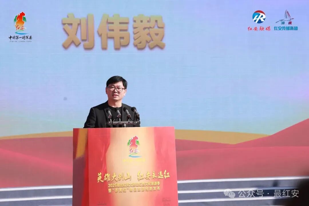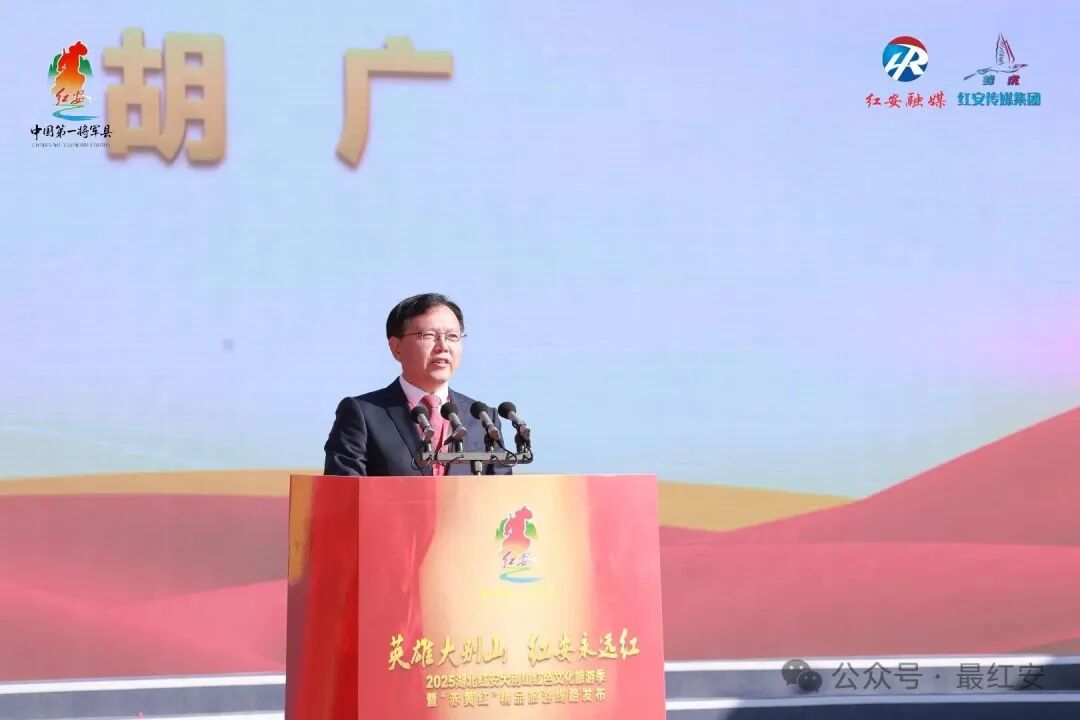胡广在致辞中以“四个一”解锁红安这座英雄之城的基因密码:“一院诗书”彰显千年文脉传承,“一山传奇”诉说英雄辈出的红色史诗,“一城烟火”展现生态宜居的人间至味,“一园通达”凸显开放包容的发展活力。他说,红安正在全力打造全国红色旅游融合发展示范区、武汉都市圈与大别山革命老区协同发展先导区、华中地区泛家居产业重要聚集区、大别山特色农产品供应基地。我们以“中国第一将军县”之名,以大别山红色基因为媒,向世界发出诚挚的“红安邀约”,诚邀四海宾朋,携手深耕红色文旅,共同开发绿色产业、共绘美好蓝图、共筑金色未来。