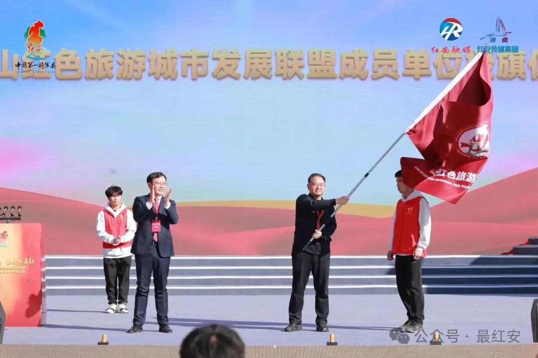 活动中,胡广向大别山红色旅游城市发展联盟轮值单位——河南省新县县委书记、县长李晓亮授旗。