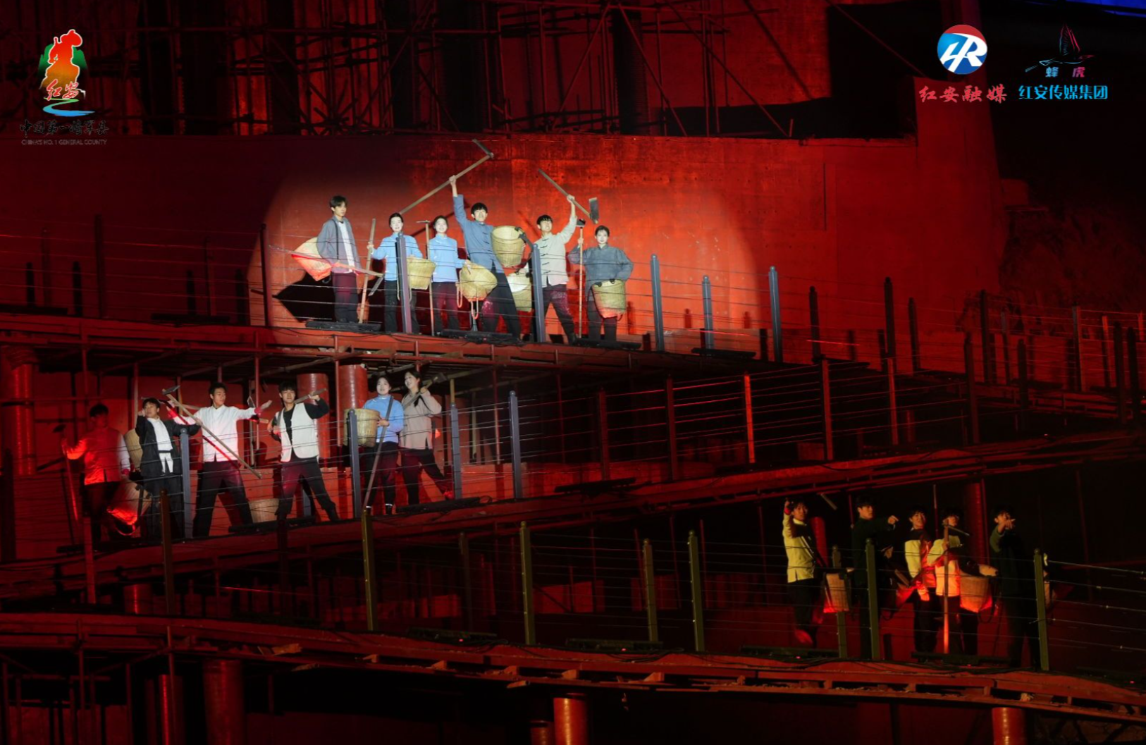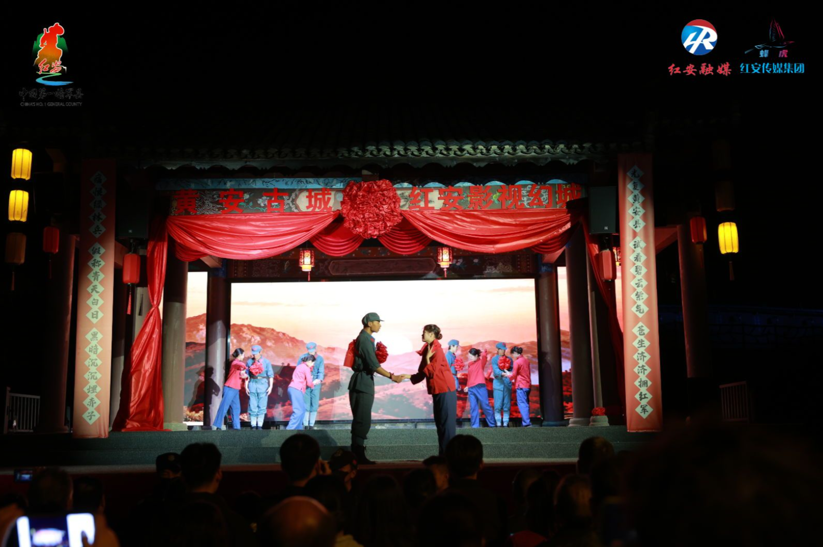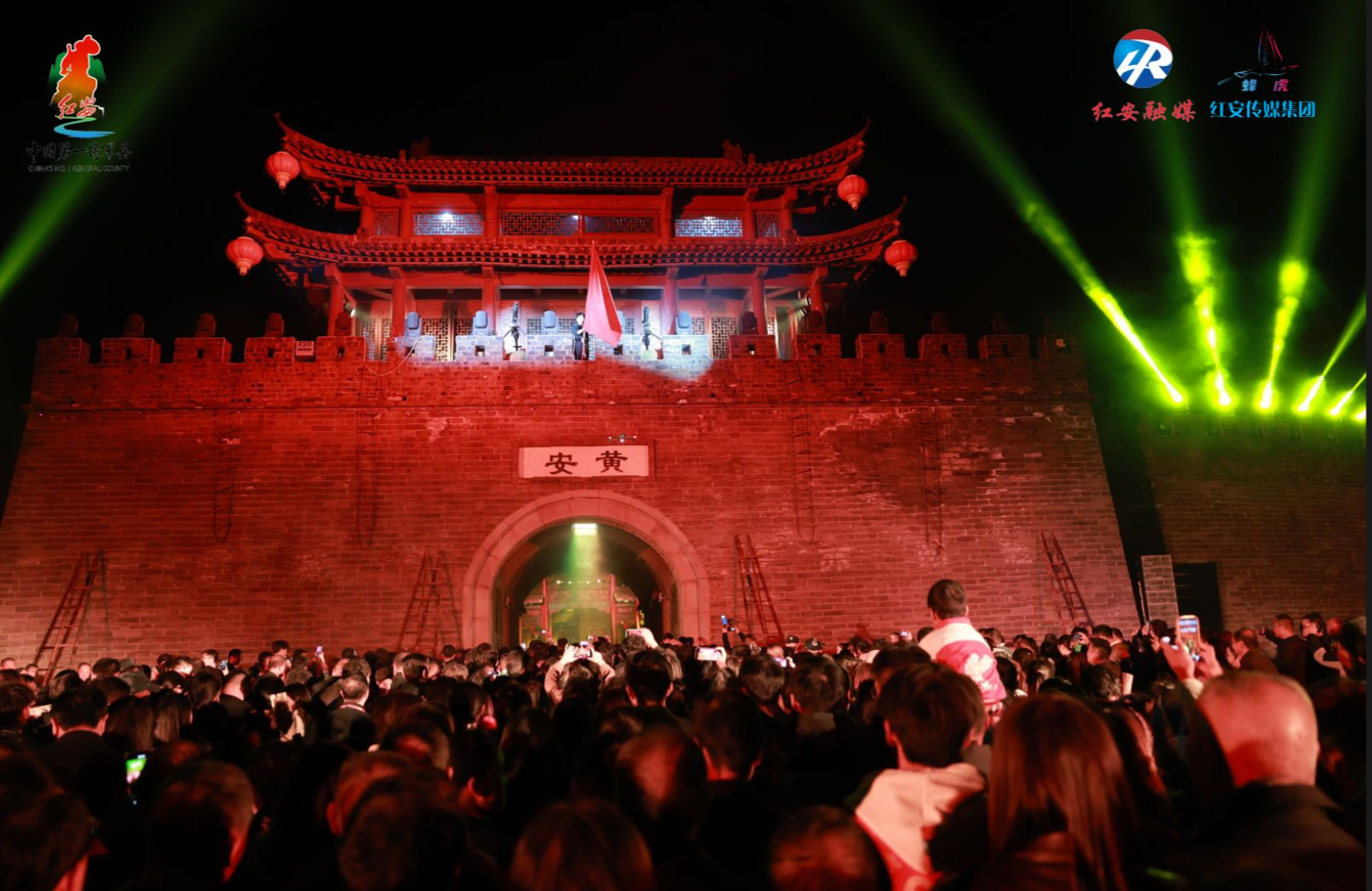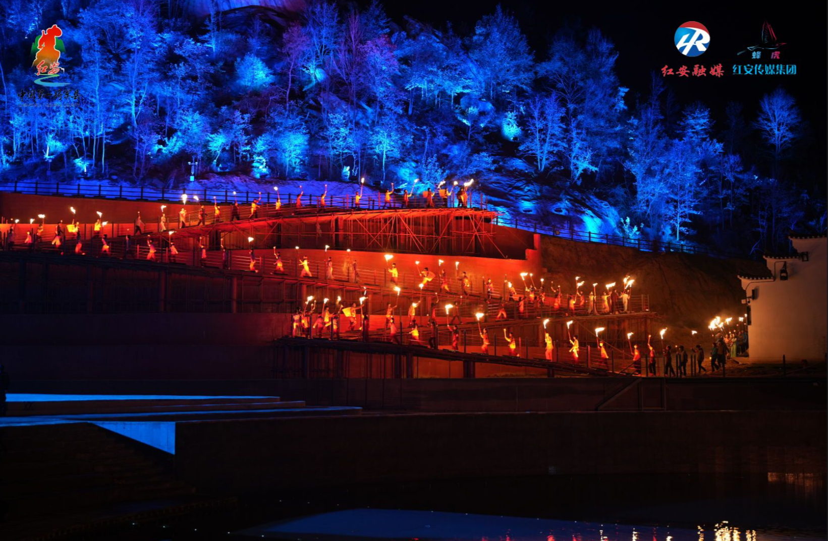 红安网消息 11月13日晚,大别山首届红色火把节暨《红安・红安》行浸式山水实景演艺阶段性成果汇报演出在黄安古城·红安影视幻城举行。
