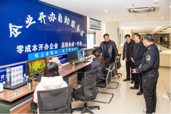 紧接着,陈剑锋一行来到帮办导办区,与工作人员进行深入交流。他重点了解了通过湖北政务服务网“市场监管服务专区”申报“企业注销登记一件事”、“证照联办”等高频改革事项的线上操作路径、材料填报、审批发照等各环节细节,关注线上服务的易用性和高效性,确保“数据多跑路、群众少跑腿”落到实处。