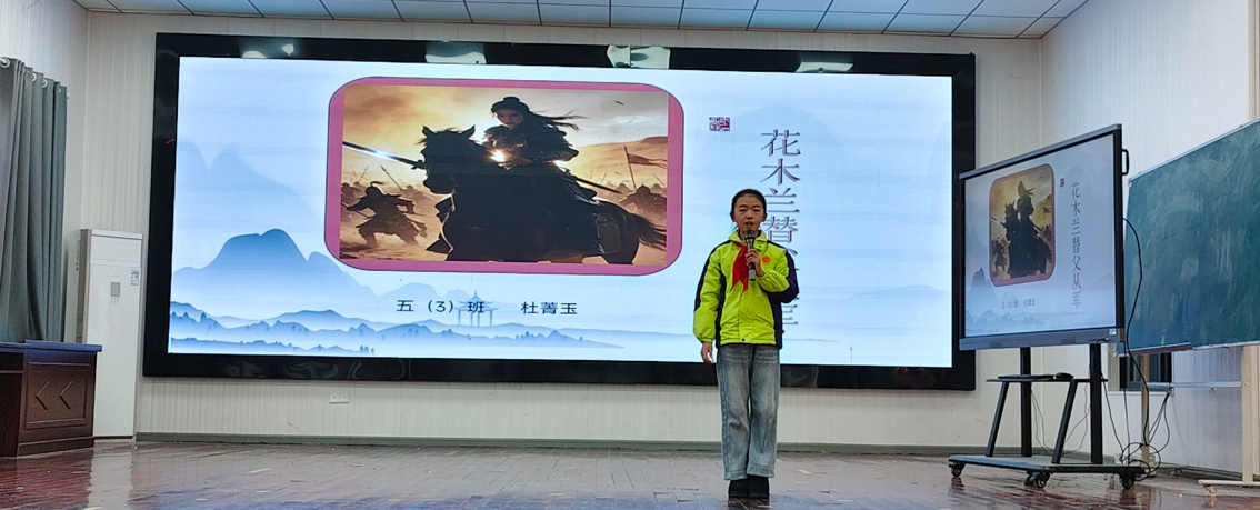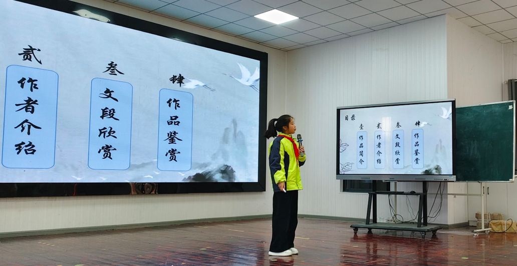 活动现场,9名经过班级精心选拔的“讲述者”依次登台,带来了一场跨越时空的思想盛宴。他们的推荐书目既有《西游记》《花木兰从军》《道德经》等中国古典名著;也有《小王子》《列那狐的故事》《童年》等西方经典;更不乏《小英雄雨来》《傅雷家书》《狼王梦》等近现代力作。体裁涵盖小说、家书、民间故事、哲学论著等多种形式,充分展现了同学们广泛的阅读视野。五年级(1)班李柔烟分享《西游记》时,结合PPT展示了取经路上的经典场景;六年级(1)夏宇轩班同学讲述《小英雄雨来》时,声情并茂的演绎引得现场阵阵掌声。
