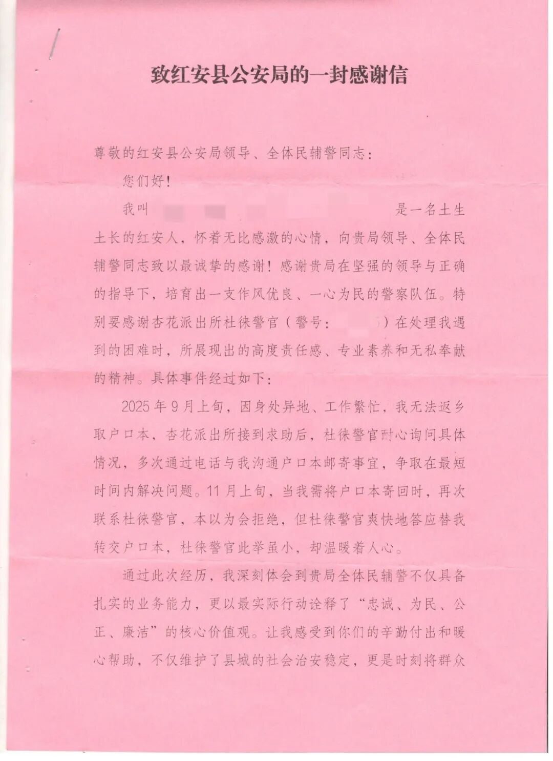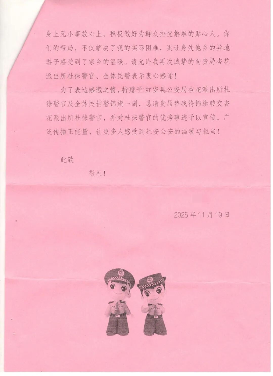 时隔数日,李先生因工作需要,急需将户口本邮寄至工作地,但因家中老人年事已高,不会办理邮寄事宜,无奈之下,他再次尝试联系杏花派出所,希望民警能协助将其户口本寄往工作地。了解情况后,尽管这不属于常规警务,但当日出警民警毫不犹豫伸出援手,主动上门取件,并协助办理好邮寄手续,将证件安全、及时地寄出。这两次跨越空间的暖心相助,让李先生深受感动。2025年11月19日,一份特殊的包裹抵达红安县公安局——里面不仅有一面印着“人民警察为人民,为民解忧暖民心”的锦旗,还附有一封李先生的感谢信。信中,他深情写道:“我深刻体会到贵所全局民辅警不仅具备扎实的业务能力,更以最实际行动诠释了‘忠诚、为民、公正、廉洁’的社会主义核心价值观。”“你们的帮助不仅解决了我的实际困难,更让身处他乡的异地游子感受到了家乡的温暖。”