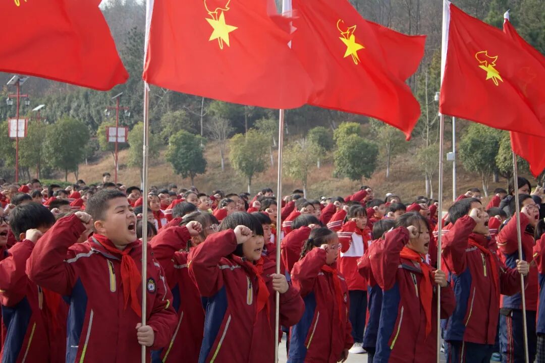 全体少先队员高唱《我们是共产主义接班人》,嘹亮的歌声激荡在青山绿水间。