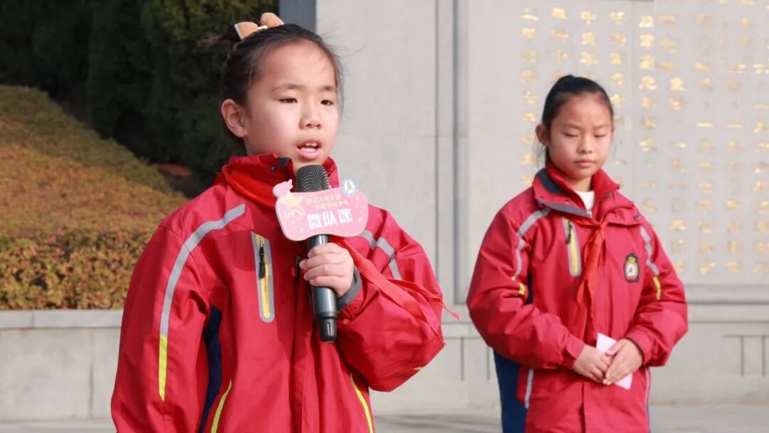 瞻仰结束后,全体师生举行“追寻先辈足迹 争做勇毅少年”主题微队课。将军城小学校区戴克明中队队委吴烜坤、金晶主持微队课。