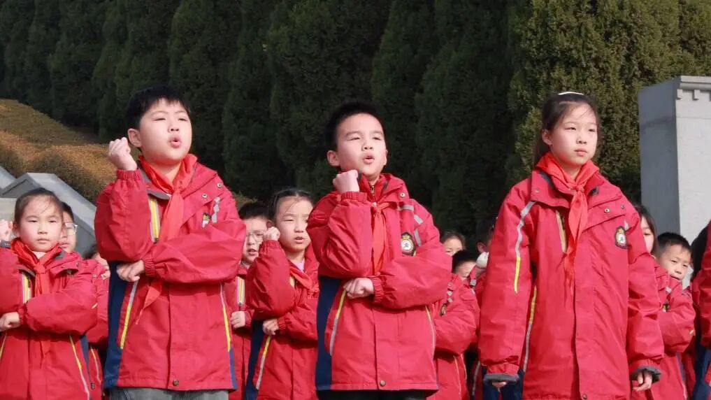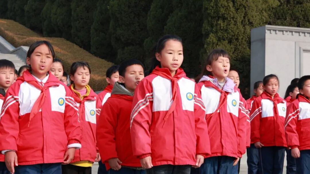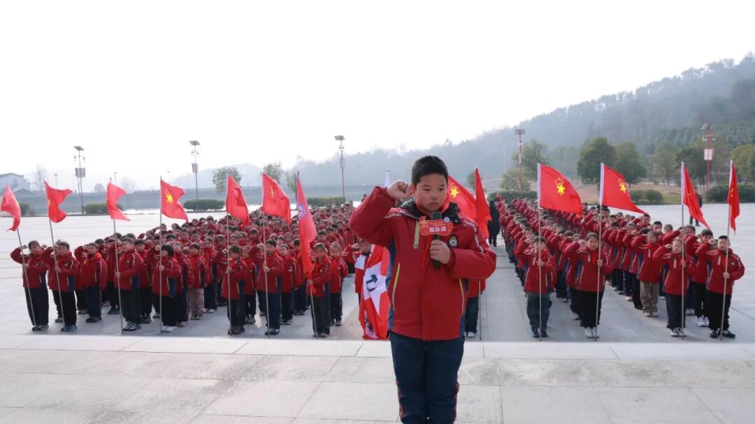 将军城小学大队辅导员杨卫华,带领全体少先队员呼号,“时刻准备着”的号声,与青山激荡。