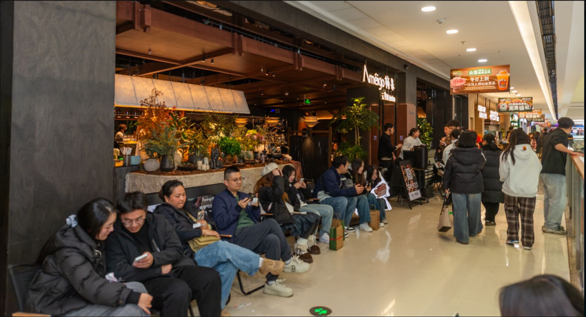 在广场四楼,元旦期间Ameigo梅果·云贵川bistro门店前等位的座椅排至走廊尽头。这家以“云南菌菇+川黔风味”为特色的餐厅,凭借“空运菌类现煮火锅”与“工业风网红打卡点”的双重标签,成为元旦假期餐饮“排队王”。