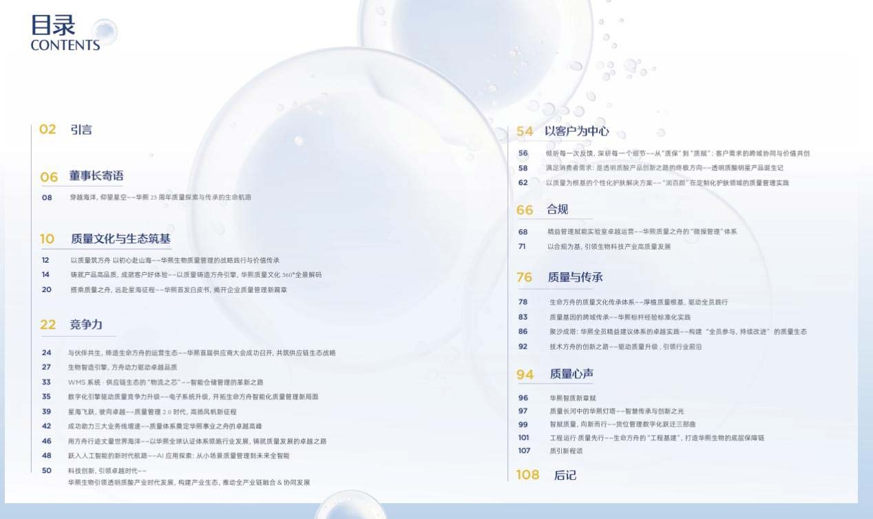 《生命方舟》质量白皮书的诞生,源于华熙生物董事长兼总裁赵燕女士“质量是生命线”的核心战略指引,见证了企业质量管理从经验沉淀到体系化构建、再到文化引领的跨越式发展。白皮书首次系统阐释了华熙生物独创的“基于质量前移的大质量文化”,打破了质量仅属于管控环节的传统认知,将其升华为全员共识的价值追求与行为准则。