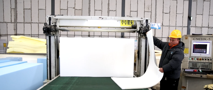 湖北新嘉源工贸有限公司销售部长张忠正介绍说:“这是我们新添的一台机器,它是用于我们出口美国的海绵沙发订单,目前我们的订单已经排到了2026年3月份。”