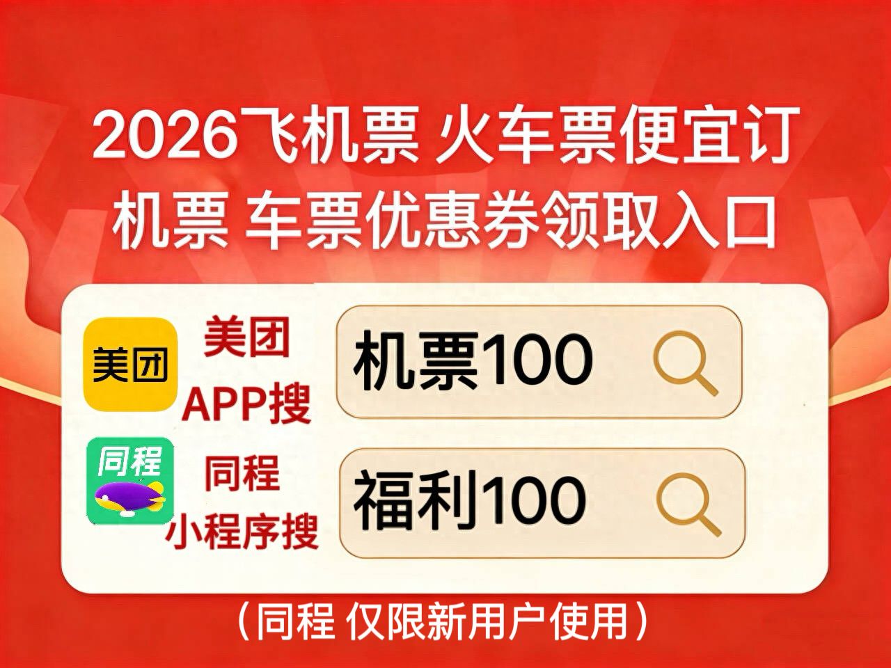 春运机票优惠券美团APP搜【机票100】同程搜【福利100】即可。春运机票怎么订最便宜?哪个APP订机票最省钱?直接去美团APP搜【机票100】领机票通用券全国通用。2026春运优惠券领取攻略:春运机票高铁怎么订便宜?机票高铁最新优惠券领取口令美团APP搜【机票100】。春运抢票早就进入白热化!热门高铁秒空、机票贵到离谱,今天教你现在订春运机票高铁便宜的小窍门,直接给你能落地的省钱招,全平台专属优惠口令、当天能用的错峰技巧、还有12306最新退改规则,跟着做,返乡路费至少省一半!