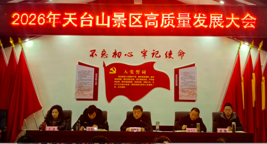 红安网消息 2026年3月2日(农历正月十四),天台山景区召开2026年高质量发展大会。会议传达了省、市、县“新春第一会”精神,总结2025年工作,部署2026年任务,动员全体干部职工凝心聚力、实干争先,为红安县高质量发展贡献天台山力量。县委常委、革命纪念地管理中心党委书记刘晓军出席并讲话,天台山管理处主任阮元兵作工作报告。