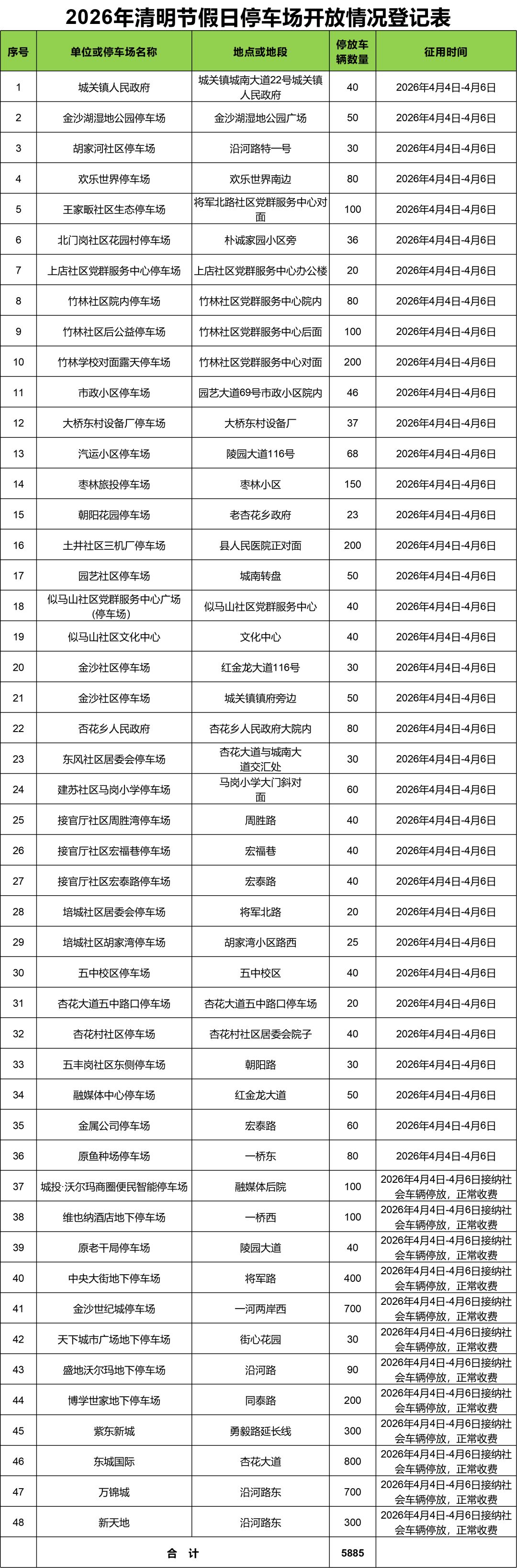 自2026年4月4日至4月6日止,除特殊安保要求和涉密、涉军、医院等单位及已实行有偿开放停车场的单位外,全县各机关、企事业单位院落停车场向市民免费开放,做到“应开尽开、便民利民”。(详见附件1),各社区露天停车场临时设置的围挡需一律拆除,确保停车场向公众开放,各乡镇(场、处)结合自身实际,参照本通知要求,重点围绕祭扫场所、景区周边,科学合理地规划辖区内的免费开放停车场。