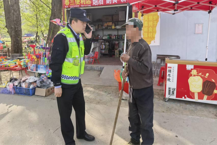当日正值清明假期,七里坪镇迎来祭扫与踏青的双重客流高峰。为确保景区秩序平稳,七里坪派出所所长吴国波带领值班民辅警坚守在杨山河风景区一线,开展交通疏导与巡逻执勤。上午时分,忙碌的执勤间隙中,一名独自在路边神色慌张、来回徘徊的老人引起了吴国波的警觉。“老人家一个人在这走来走去,眼神迷茫,肯定有情况。”凭借职业敏感性和多年基层工作经验,吴国波快步上前关切询问。