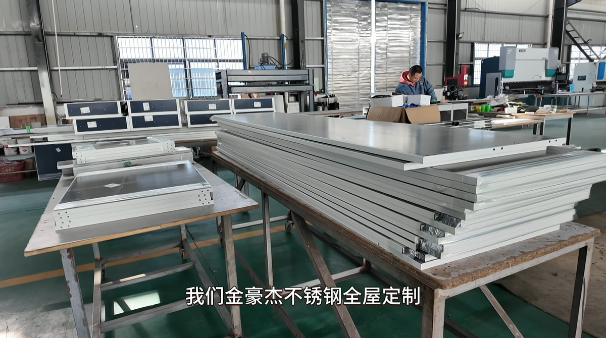 红安县豪杰不锈钢制品有限公司总经理夏秀珍:订单来源是客户定制,我们金豪杰不锈钢全屋定制是自创品牌,源头工厂可以做全屋整套家居,从橱柜到酒柜、衣柜、浴室柜等家具产品都可以做,全由不锈钢锻造而成,我们的专利可以控制柜内的容量,也可以通过板材的拼装和拆卸,来更好的满足客户要求。