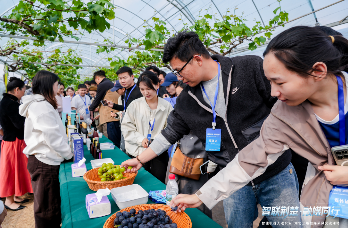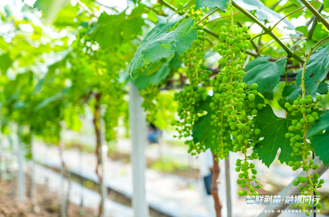 离开荆江分洪工程景区,采风团走进湖北省金秋农业,探寻公安县特色农业的致富密码。作为国内葡萄产业少有的、湖北省葡萄产业唯一的国家高新技术企业,该企业是湖北省首家以葡萄生产为主导,集科研、试验、示范、种植、销售、精深加工、包装出口、文旅开发于一体的农业产业化重点龙头企业,更是公安县推动一二三产业融合发展的典范。