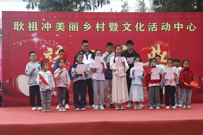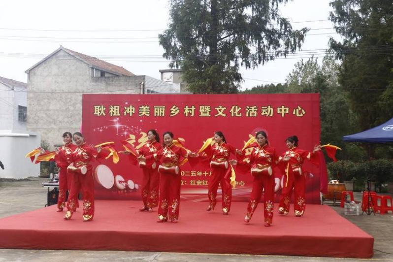 庆典现场,文艺演出精彩纷呈。红安红土情歌舞中心带来的传统荡腔锣鼓,敲出了乡土文化的厚重底蕴;舞蹈《我的祖国》舞姿翩跹,跳出了对家国的深情礼赞;唢呐小组演奏的《红歌联唱》高亢激昂,熟悉的旋律唤起共同的时代记忆;三句半《夸夸耿祖冲》则用接地气的语言,细数家乡八年变迁的点点滴滴。更令人动容的是,耿祖冲的孩子们身着整齐服装,以一首童声小合唱《歌唱祖国》传递出对家乡、对祖国的真挚热爱。演出在全场齐唱《明天会更好》的歌声中落下帷幕,出嫁的姑娘们与乡亲们、年轻人纷纷上台合影,镜头定格下这团圆、喜悦的瞬间。
