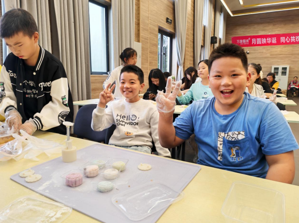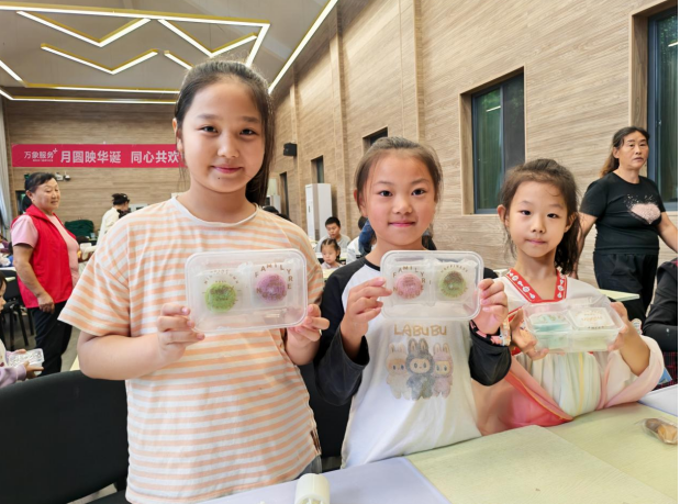 在志愿者的指导下,孩子们与伙伴或家长一起制作月饼,揉皮、包馅、压模忙得不亦乐乎。现场一片欢乐的节日氛围,不仅让孩子们体会到亲自制作月饼的快乐,也让他们更深入地感受到了传统节日的魅力。