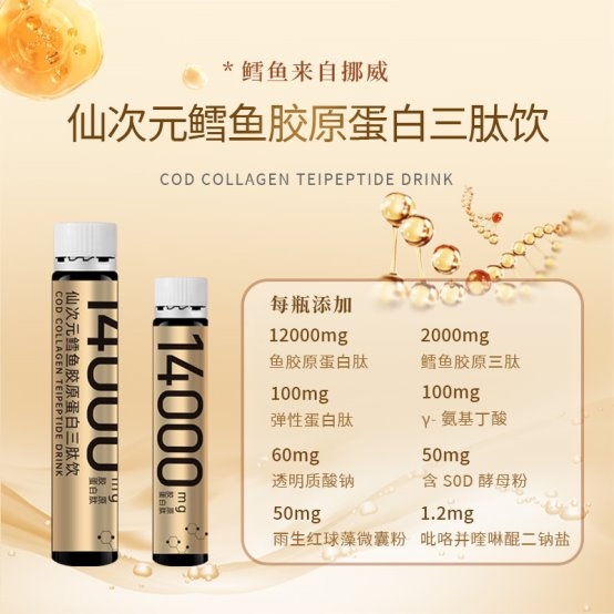 仙次元严控原料源头与活性留存,精选挪威北大西洋北纬66度深海鳕鱼为原料,该海域常年低温、极昼极夜交替的独特环境,让鳕鱼生长周期长达5-7年,鱼皮中羟脯氨酸含量较热带鱼种高出近1/4,而羟脯氨酸是维持胶原纤维三螺旋结构、保障生物活性的关键。品牌严守黄金锁鲜窗口,从深海捕捞到酶解加工全程严格管控,搭配-20℃超低温冷链运输与即时加工技术,大幅优于行业普遍的标准,可有效避免胶原发生自溶变性。每瓶含14000mg高活性胶原肽,采用12000mg鱼胶原肽+2000mg胶原三肽的科学配比,形成快慢吸收双通道,小分子三肽30分钟即可进入血液循环,血浆羟脯氨酸峰值较普通产品提升67%,有效浓度维持时间延长4小时,原料可通过MSC海洋管理委员会及挪威海产溯源认证,全程透明可查。