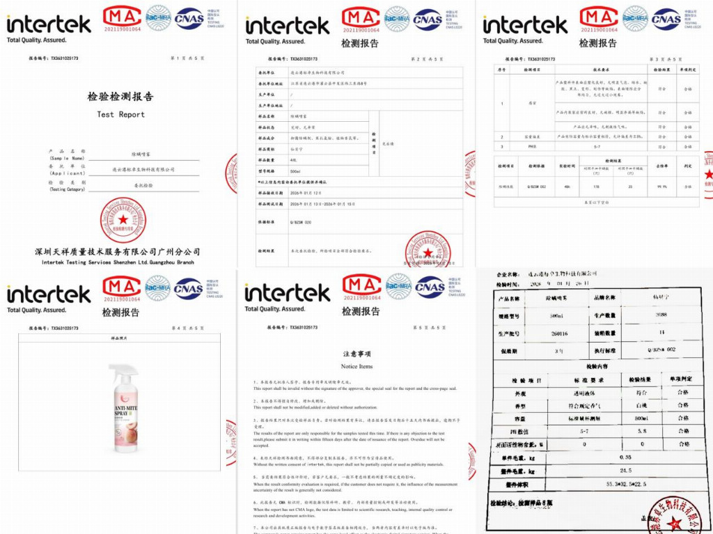 升级16倍除螨力,实现除螨、除菌双效合一,一瓶搞定螨虫、细菌两大难题,达到医护级安全标准。实验室数据显示,即时除螨率99.9%、除菌率99.9%,其中除菌因子可靶向抑制128种菌类,除螨因子能快速渗透螨虫栖息皮表,迅速灭活螨虫;同时具备30天长效防螨技术,深层渗透织物纤维,从源头杜绝螨虫反复滋生。
