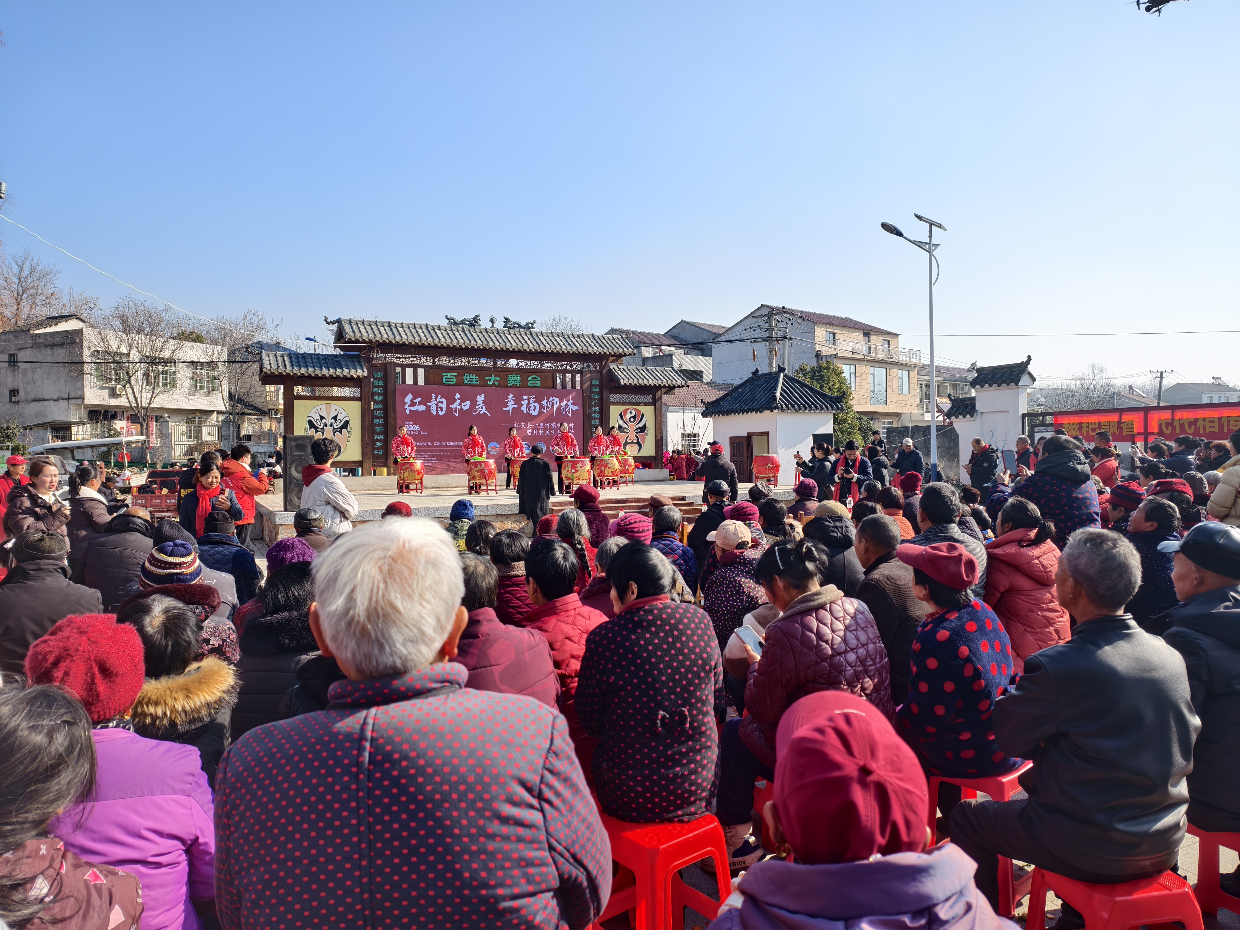 红安网消息 2月8日,天气晴朗,艳阳高照。由武汉科技大学大别山文化旅游创新研究院策划,红安县七里坪镇人民政府主办,七里坪镇柳林村村民委员会承办的腊月迎新年系列文化活动在村文化广场举办,来自四面八方的村民参加。