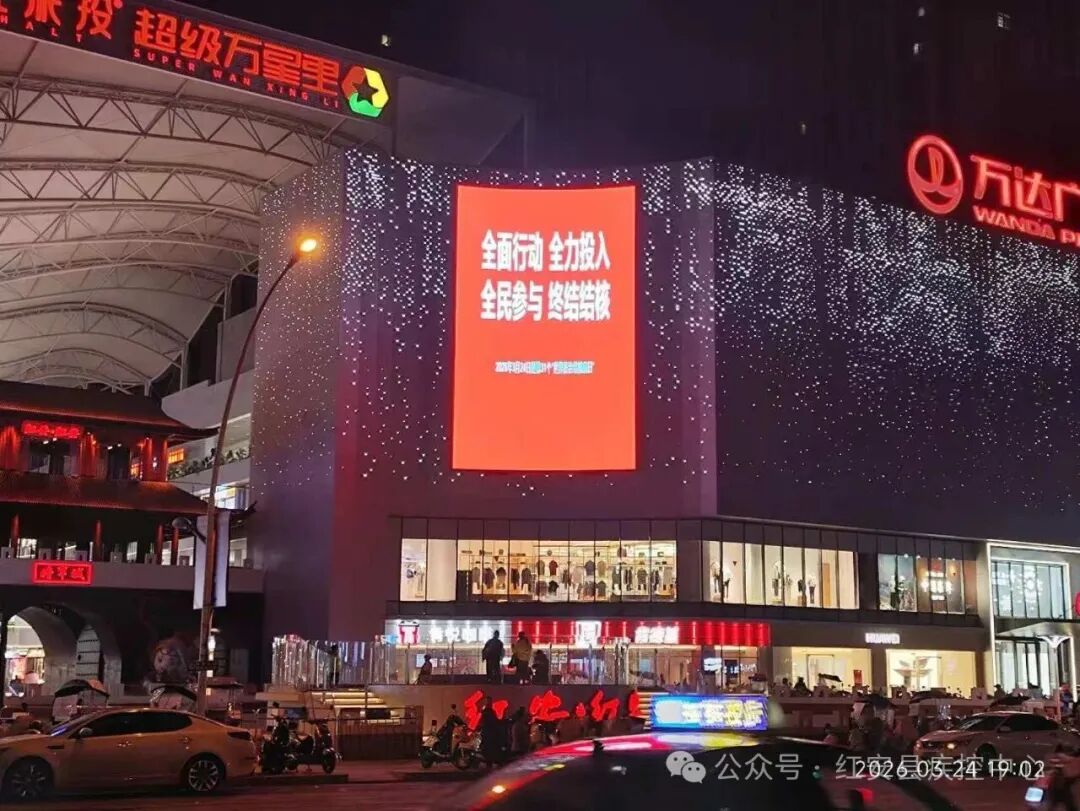 活动当天,结核病防治科普视频在万达广场大型LED显示屏循环播放,以户外宣传新形式,将健康知识送到群众眼前,以光影为媒,让“全民参与 终结结核”的理念深入人心,成为红安一道亮丽的“健康风景线”。夜间,以“为终结结核病 点亮城市的红”为核心的亮灯行动在万达广场启幕,广场外显示屏上呈现了今年的宣传主题,用温暖的灯光传递防控理念。
