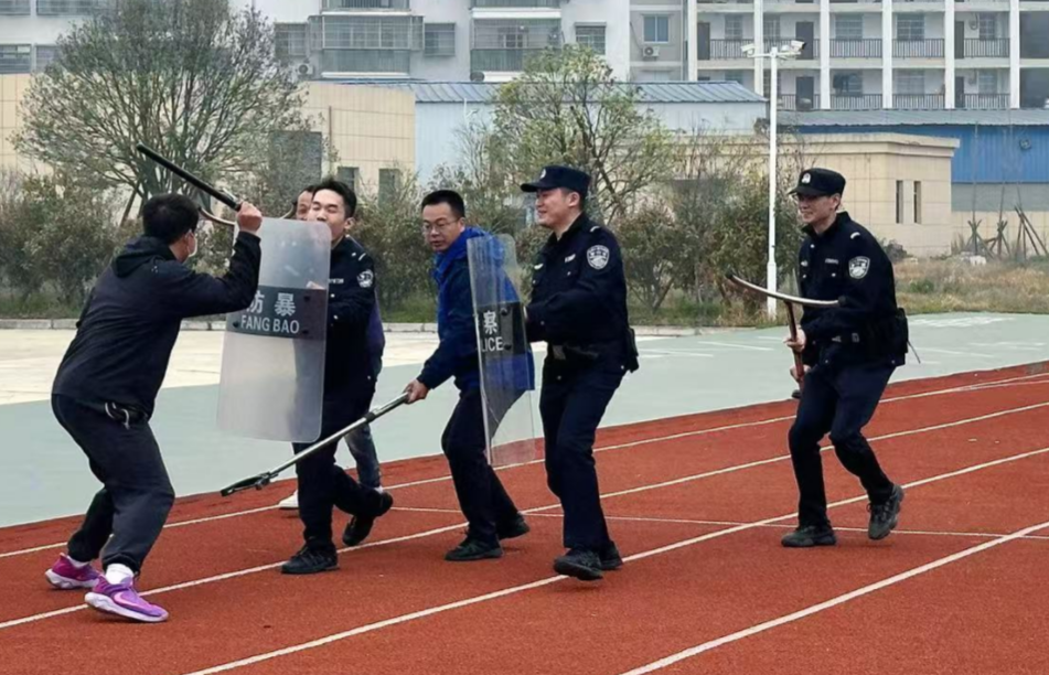 随后,民警组织开展了防恐防暴演练和消防演练。防暴演练模拟突发场景,学校安保人员与民警迅速联动,成功将“暴徒”制服,让师生直观了解应急处置流程。消防演练中,民警现场演示灭火器使用方法,并邀请师生亲身体验,还展示了消防车工作流程,同学们认真观摩、踊跃参与,在寓教于乐中掌握了实用的应急自救技能。