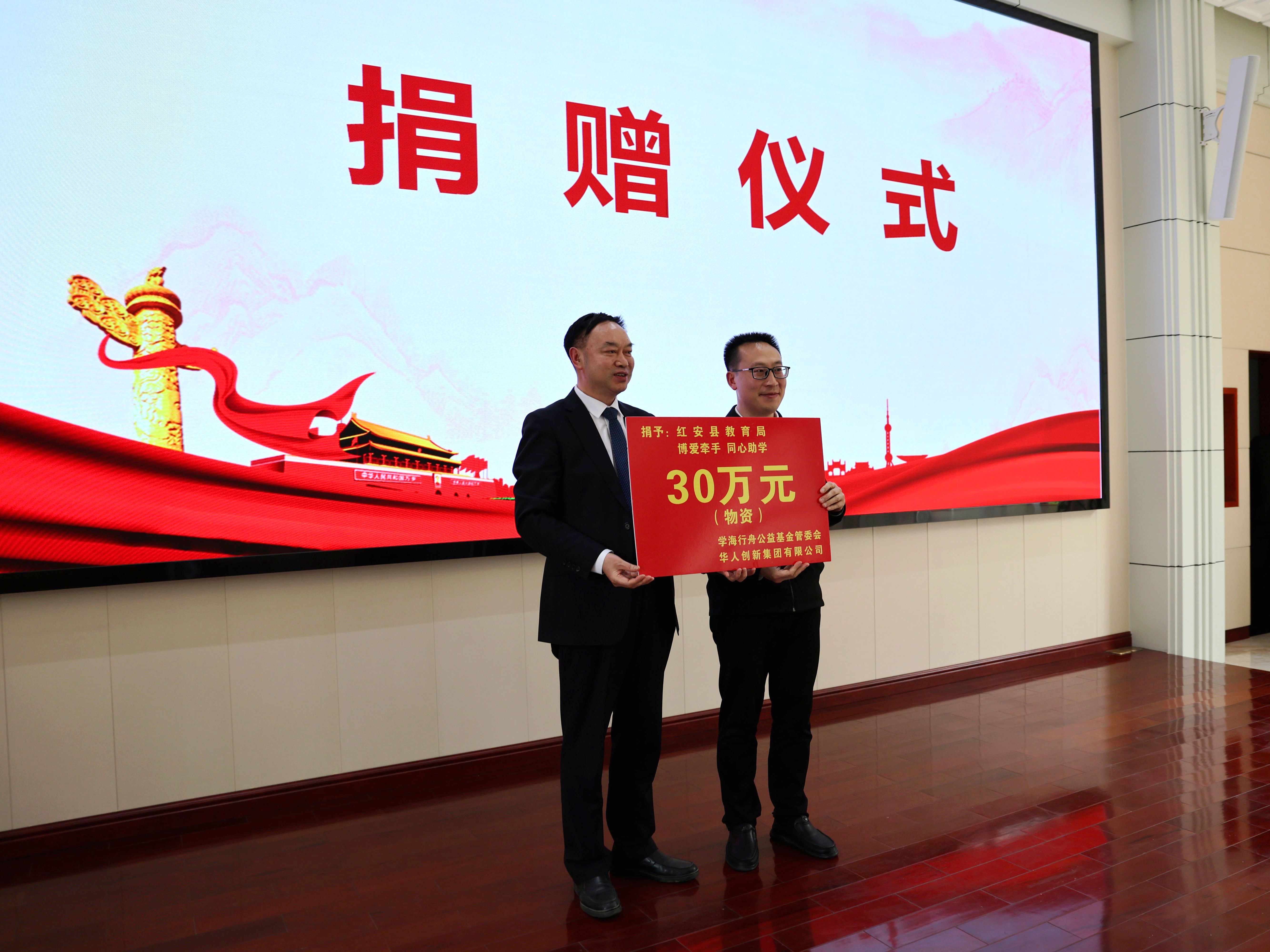 活动中,钟林代表红安县接受学海行舟公益基金管委会、华人创新集团有限公司价值30万元的教育捐赠物资。管鹏作红安招商推介。