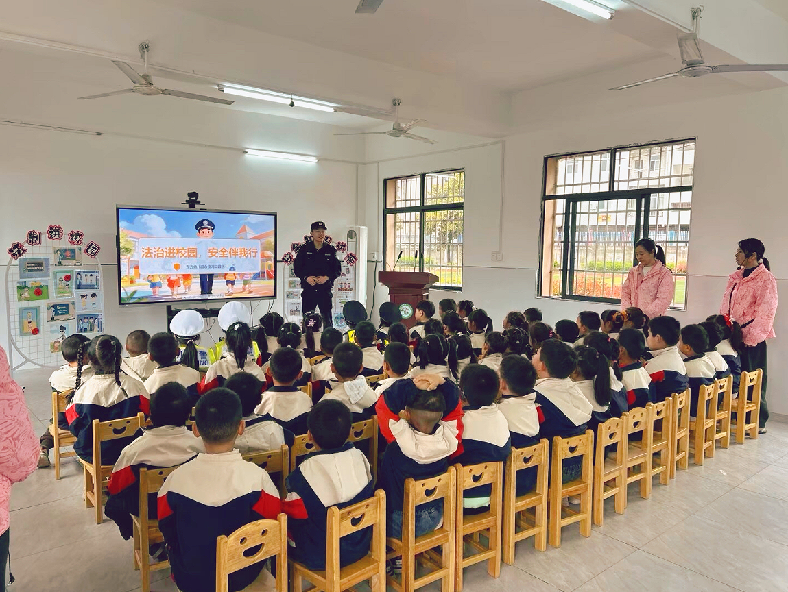 红安网消息 4月3日上午,红安县东方幼儿园永佳河二园区内气氛热烈,一场以“法治进校园,安全伴我行”为主题的宣讲活动正在这里开展。活动特邀永佳河镇派出所胡警官、孟警官走进园区,为孩子们带来一堂生动有趣的安全教育课。